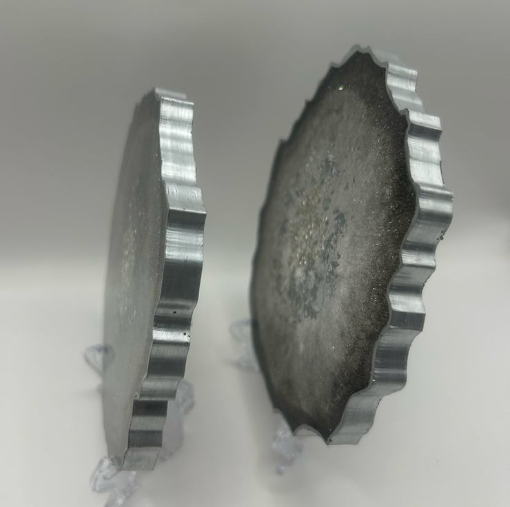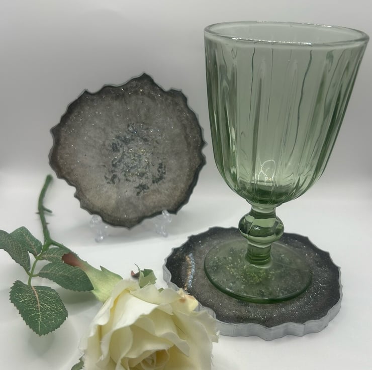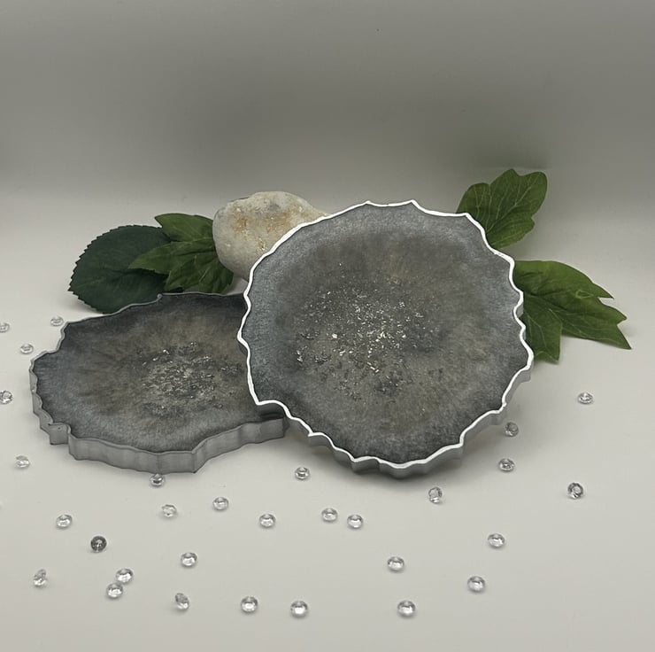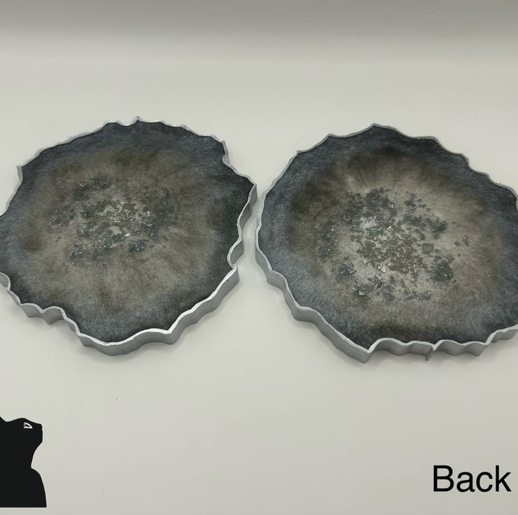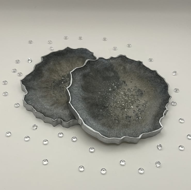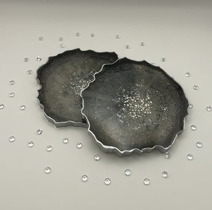 Looking for something special to adorn your dining table or having friends around and want something to add a little pizzazz to the occasion? Or need something to protect your furniture whilst having your morning cuppa but want something different? Here it is. Set of two geode style resin coasters in beautiful shades of black and grey. In the centre, almost floating, sits crushed silver glass and silver leaf and to compliment this, the coasters are edged is silver acrylic pen. These are irregular shaped which gives them a bit more character. Depending on your preference, you could also reverse them - each face giving a different appearance. Please note, these are not opaque.