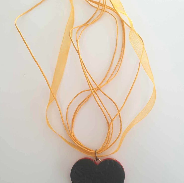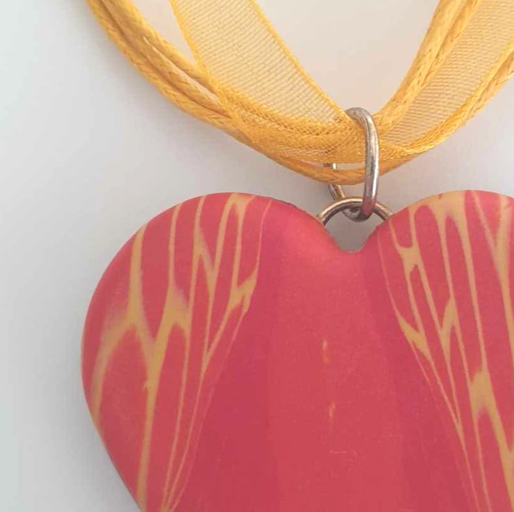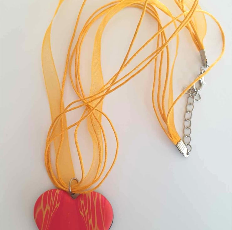 This is a beautiful large orange and yellow heart pendant hung on pretty yellow cotton cord and ribbon necklace.