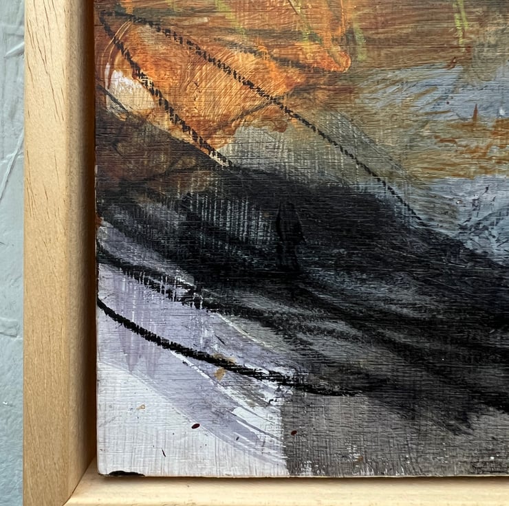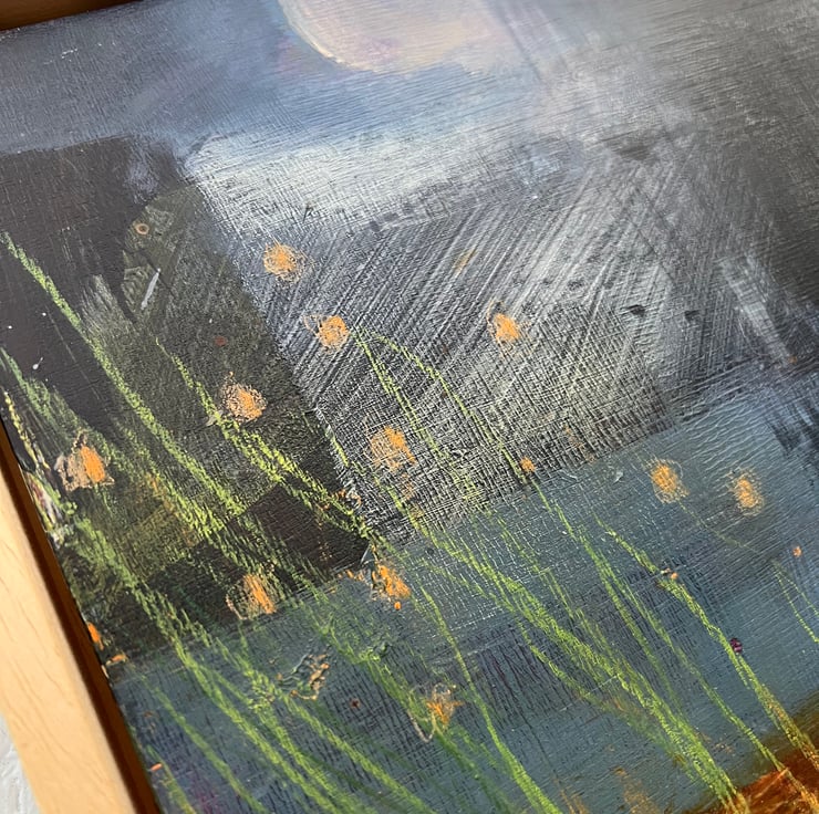 Semi-abstract landscape painting inspired by the wild moorlands of the Peak District National Park. Painted in acrylic and mixed media (various pencils and pastels) on 5mm birchwood ply panel.