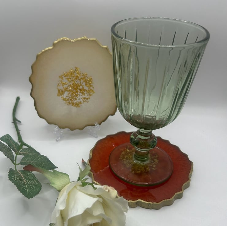 Looking for something special to adorn your dining table or having friends around and want something to add a little pizzazz to the occasion? Or need something to protect your furniture whilst having your morning cuppa but want something different? Here it is. A geode style resin coaster in beautiful understand gold hues. In the centre, almost floating, sits crushed gold glass and gold leaf and to compliment this, the coaster is edged is gold acrylic pen. The coaster is irregular shaped which gives it a bit more character. The overall aesthetic of this coaster is one of elegance and sophistication. Just think of placing your chilled glass of wine, beer, champagne or squash down on this coaster - divine! I am also selling a red version which works really well with this one - see available options if you would like both coasters. Please note, coaster is not opaque.