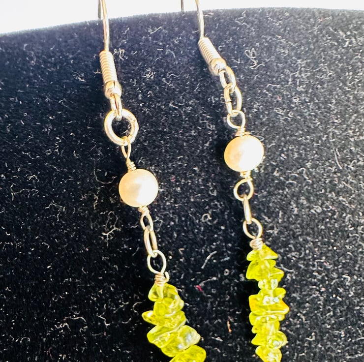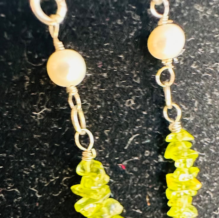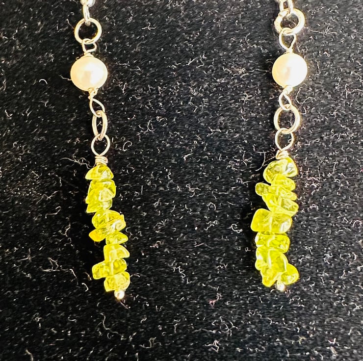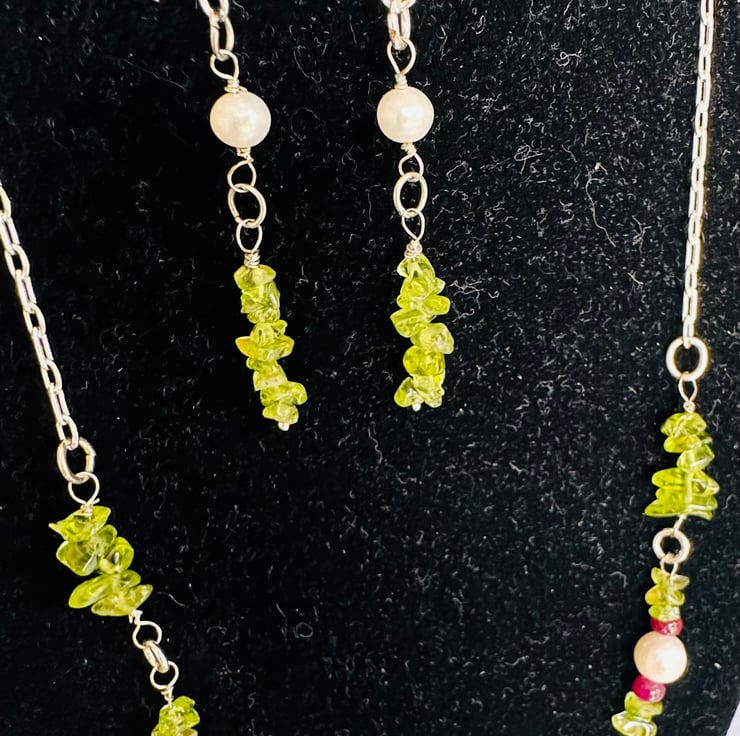 A lovely delicate. Silver, peridot, freshwater pearl and ruby necklace August birthday stone, will fit any occasions