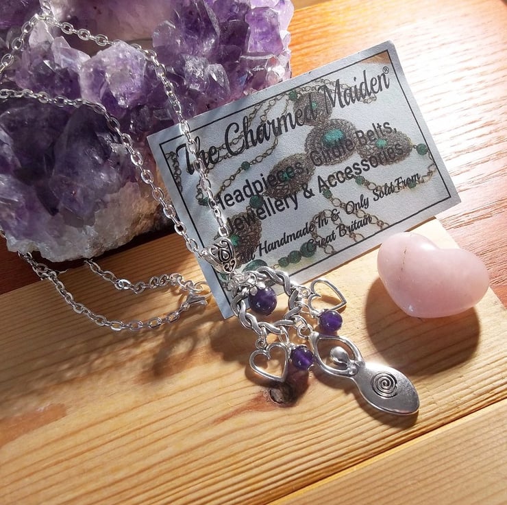 Handmade Amethyst, love heart, goddess & Celtic eternal wreath knot pendant necklace. The pendant is suspended from an ornate heart decorated bail which is then threaded onto a silver plated chain.