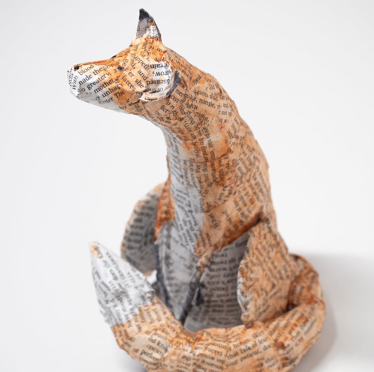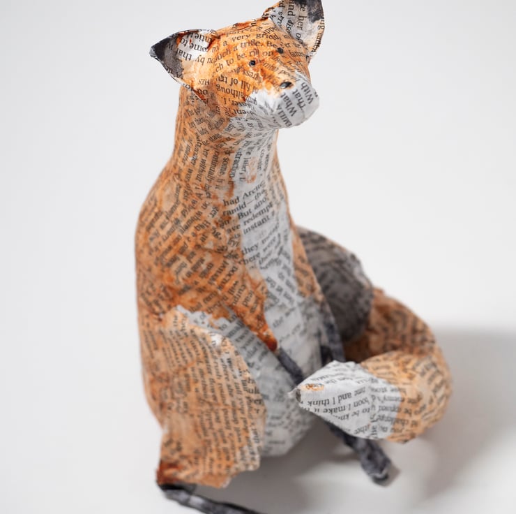 A handmade paper mache folk art sculpture of a large sitting fox. It is created from paper mache using book paper, wire and watercolour and is approx 16cm high. Made with newspaper, wire, glue, pages from Shakespeare, and watercolour paint.