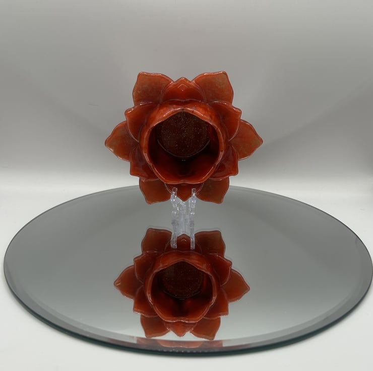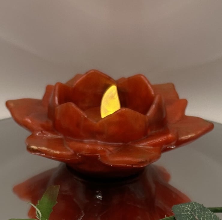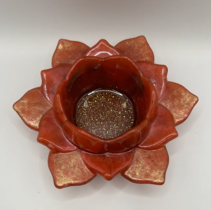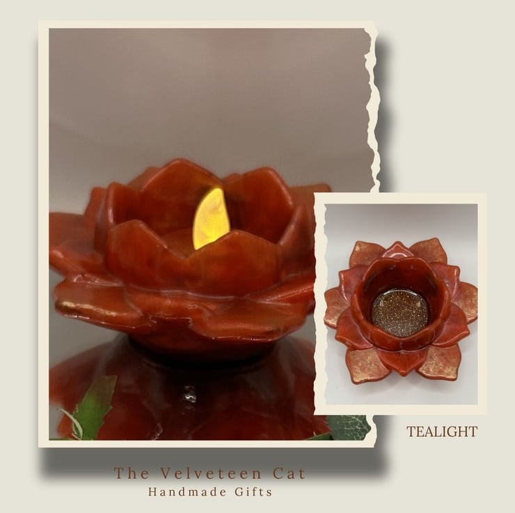Just the thing for a cosy night in or to compliment a dinner table. This lovely Lotus flower tealight holder will add a touch of elegance to any surrounding and is just so pretty when lit. Made using eco friendly high quality resin from a UK supplier. Can be used in any room where you want to create an air of ambience and relaxation. The main colour is an opaque sumptuous red with a rubbed gold effect on the bottom petals. Just imagine kicking back to some chill background music with this tealight creating the perfect atmosphere.