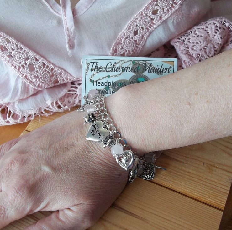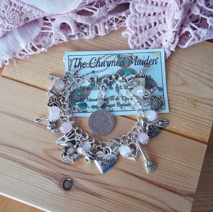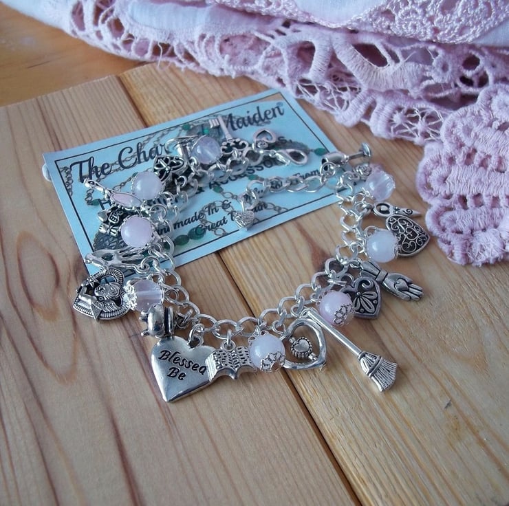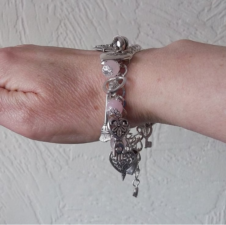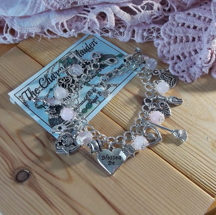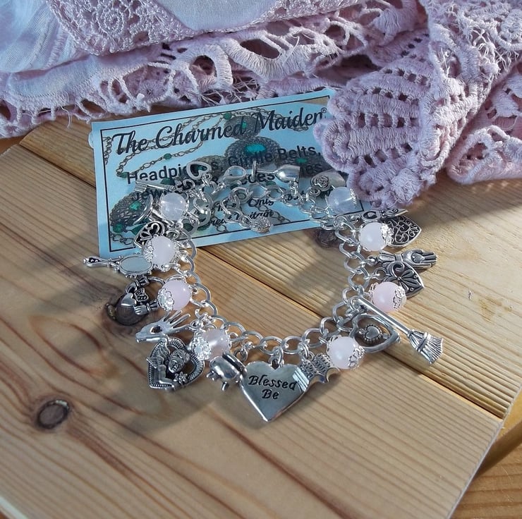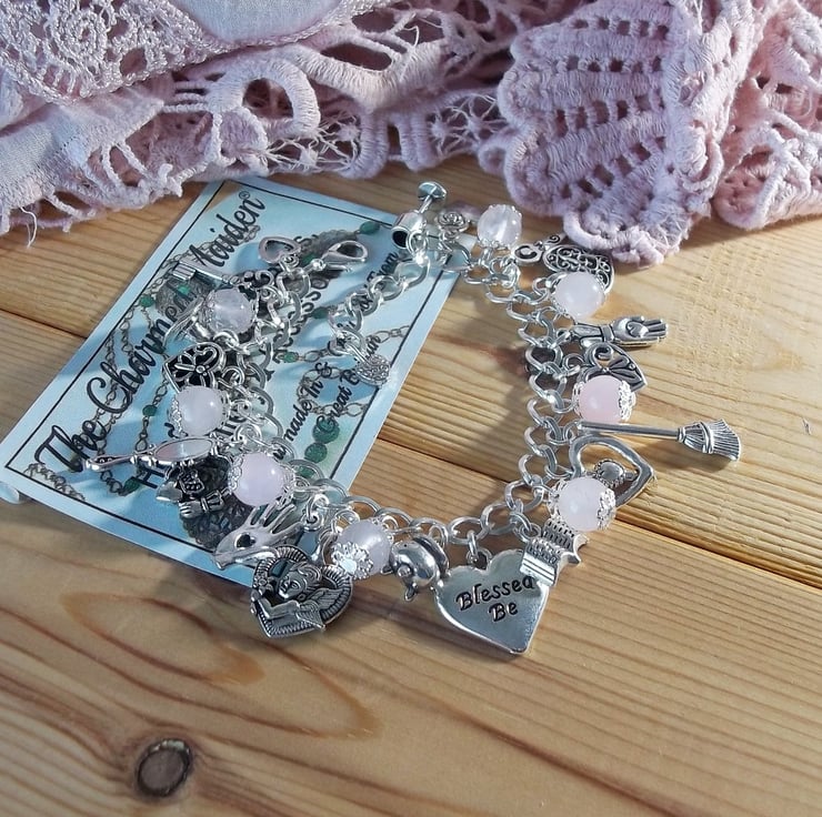 Pretty Rose Quartz & love heart Wiccan themed charm bracelet. This beautiful bracelet is beaded with eight 8mm Rose Quartz beads, each framed with pretty filigree bead caps. An array of love, heart & witchy themed charms complete the look. This gorgeous bracelet is finished with silver plated chain & is available in a choice of four adjustable lengths.