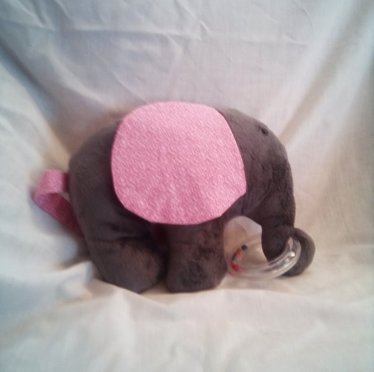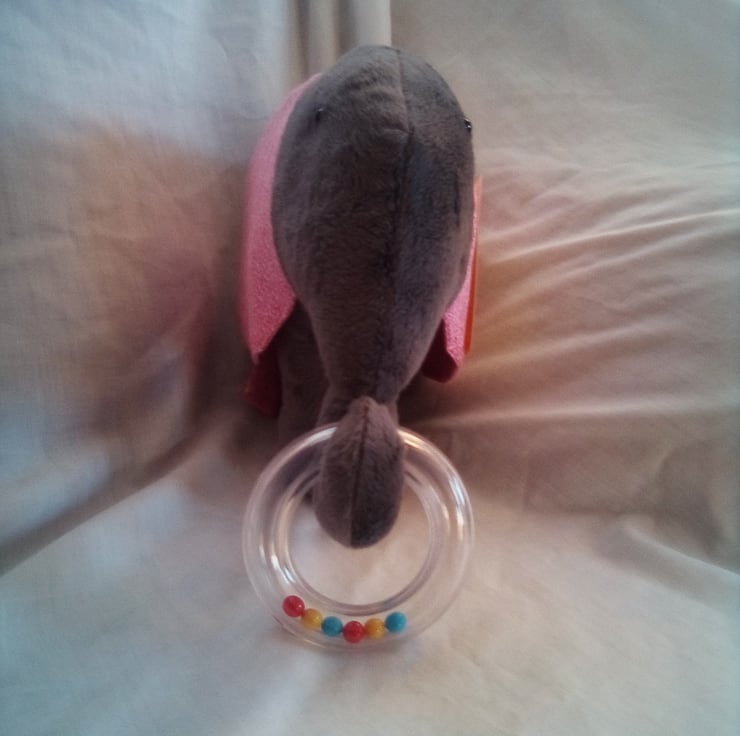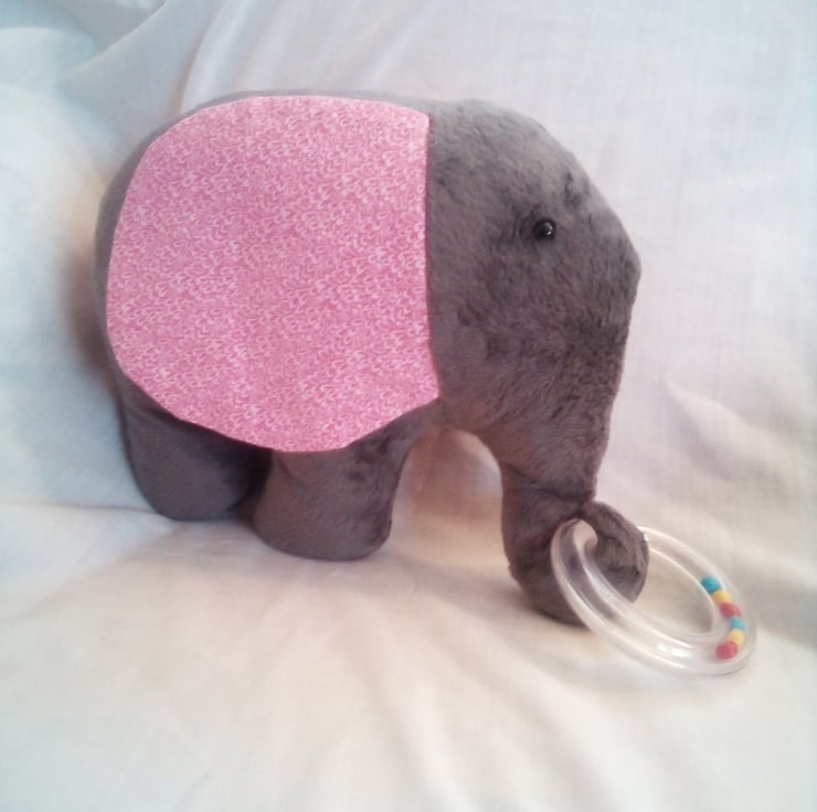 Made with Cuddle fleece fabric for the body. 100% cotton ears with crinkly paper inside. With safety toy stuffing and a rattle attached to trunk.