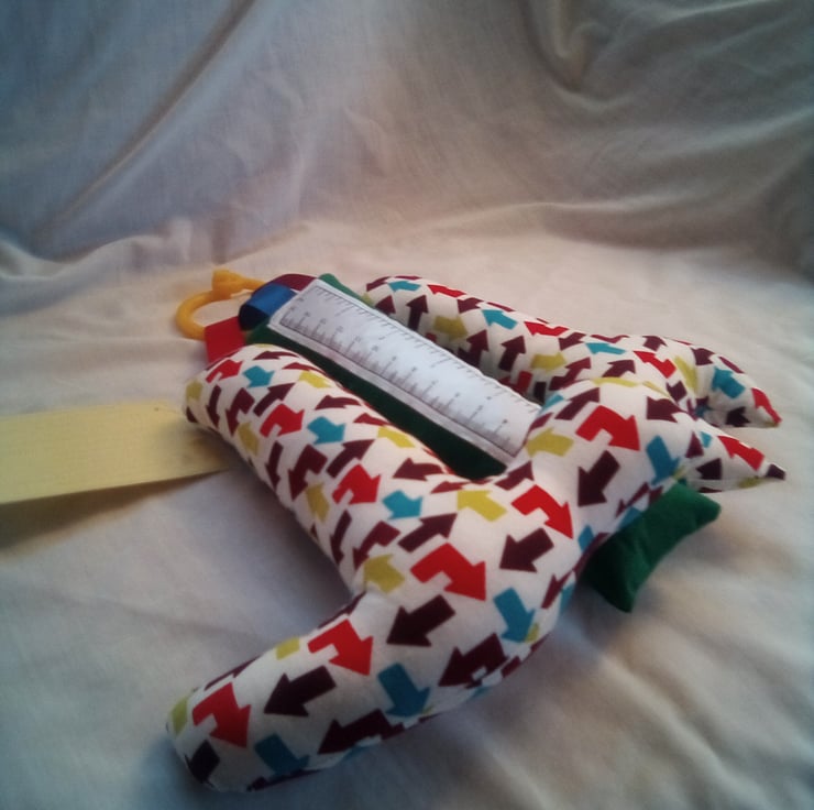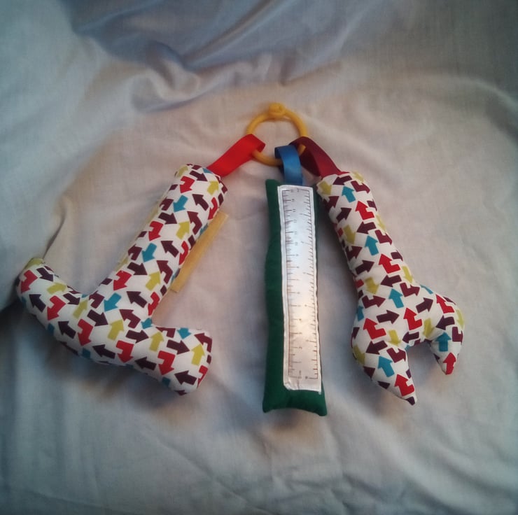 Tool set is made with 100% cotton fabric. The hammer has a jingle column inside. Ruler has crinkly paper behind the ruler, the spanner has a squeaker inside. Attached with ribbons to a teething ring. All with safety stuffing.