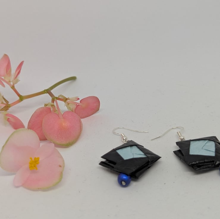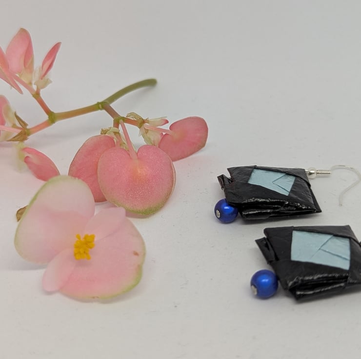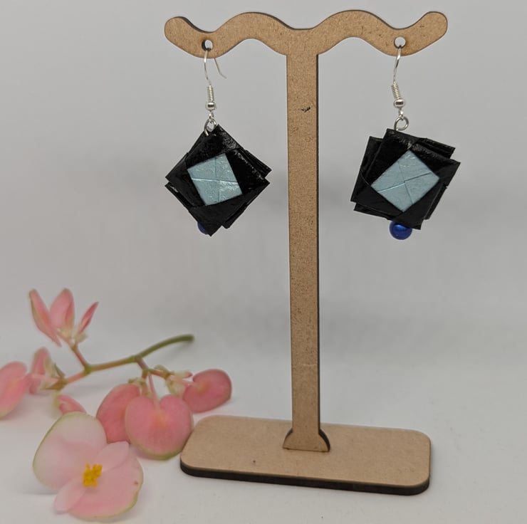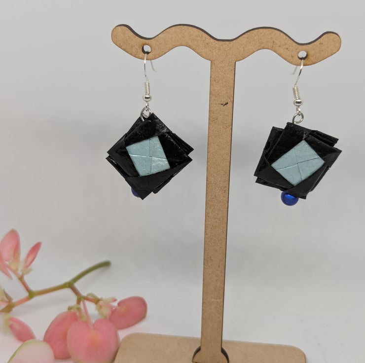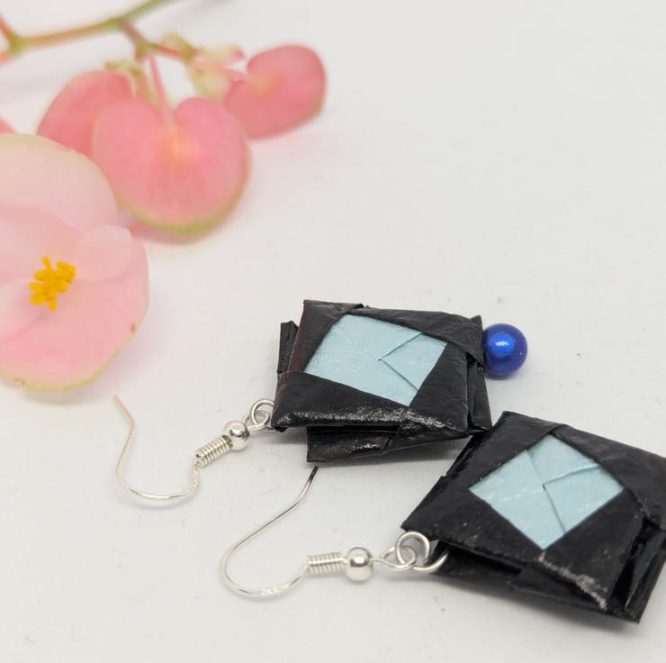 These uniquely designed earrings have been created using 2 types of Japanese Shoyu paper which is folded using origami techniques. The design is completed with the addition of small miracle beads in a complementary shade of blue, and sterling silver ear hooks, to produce earrings which measure 3 cm in length.