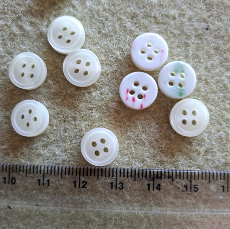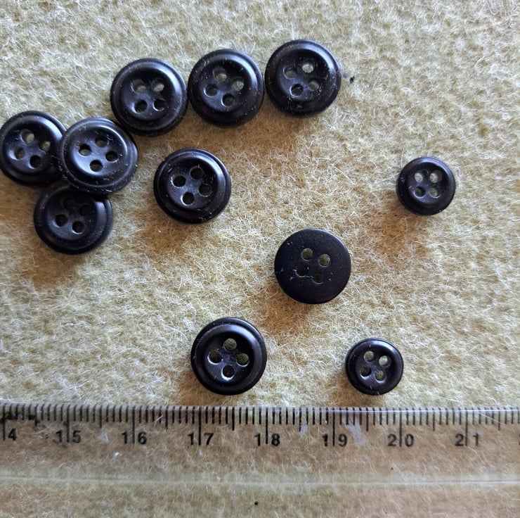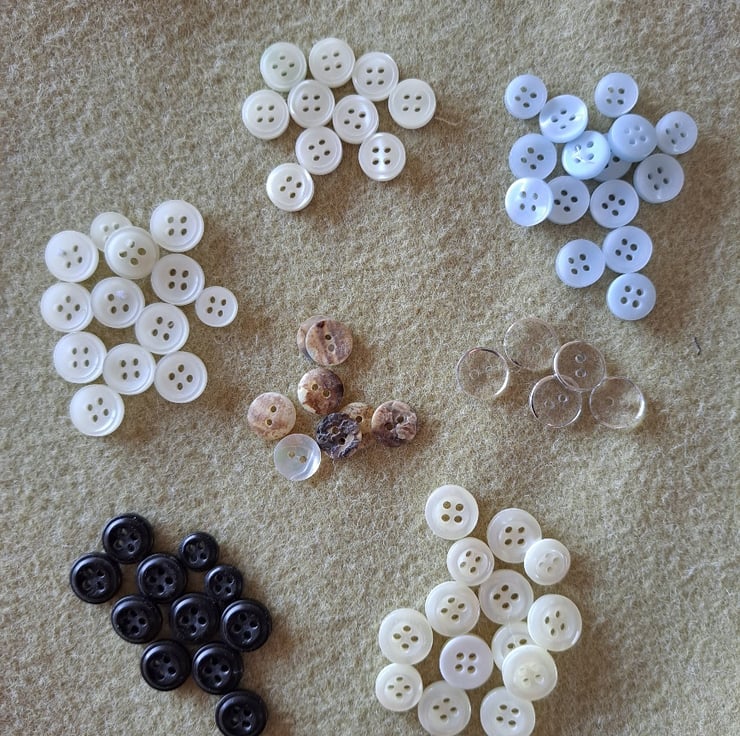 Think of all the buttons that must go into landfill on their discarded clothes. Let's do some re-homing for these perfect and re-suable fastenings. This bumper bundle contains six groups of rescued buttons, ranging from no-nonsense matt black or pearly white shirt buttons to little silver-edged ones and even a small batch of delicate shell buttons. I'll let the pictures do the talking.