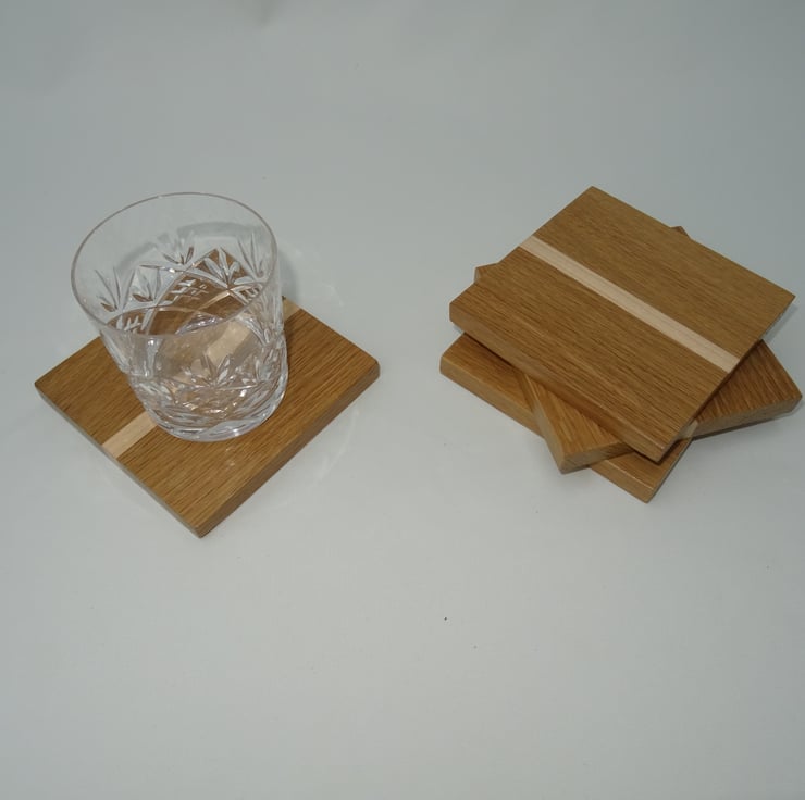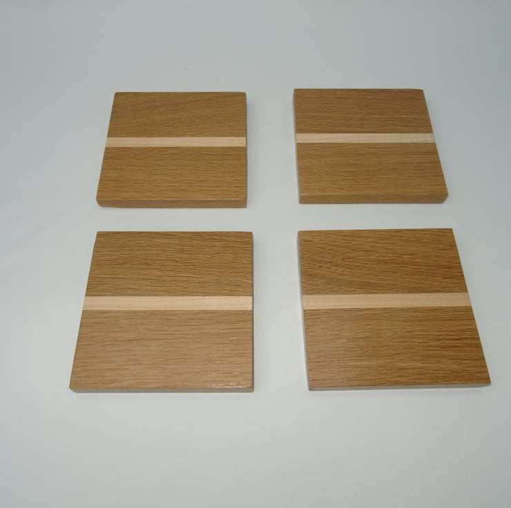 The coasters are made primarily from Oak with a decorative stripe of Sycamore in the centre.