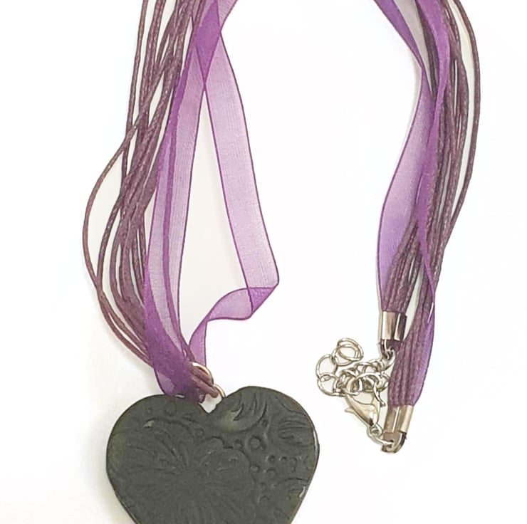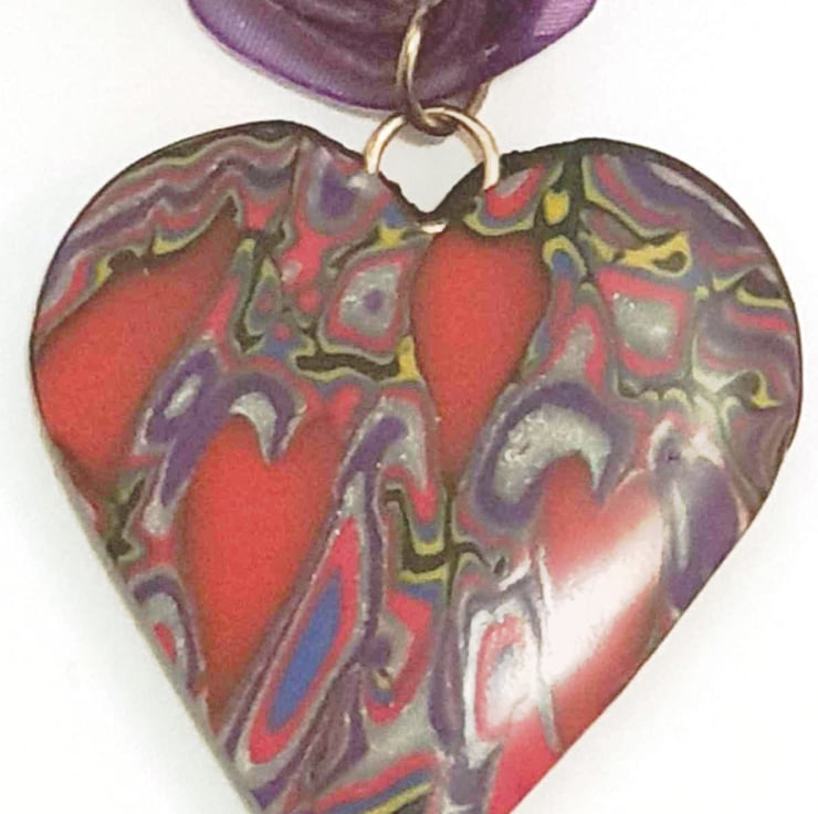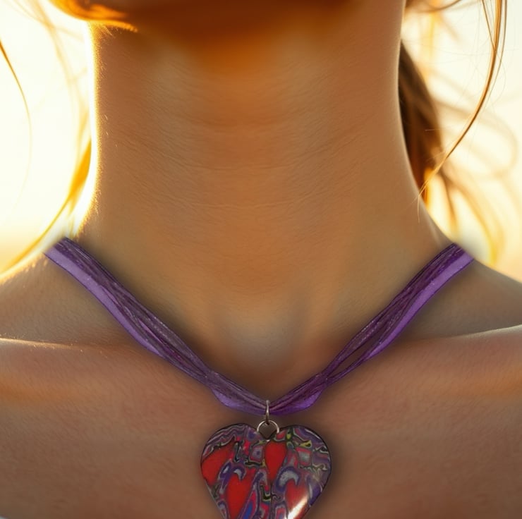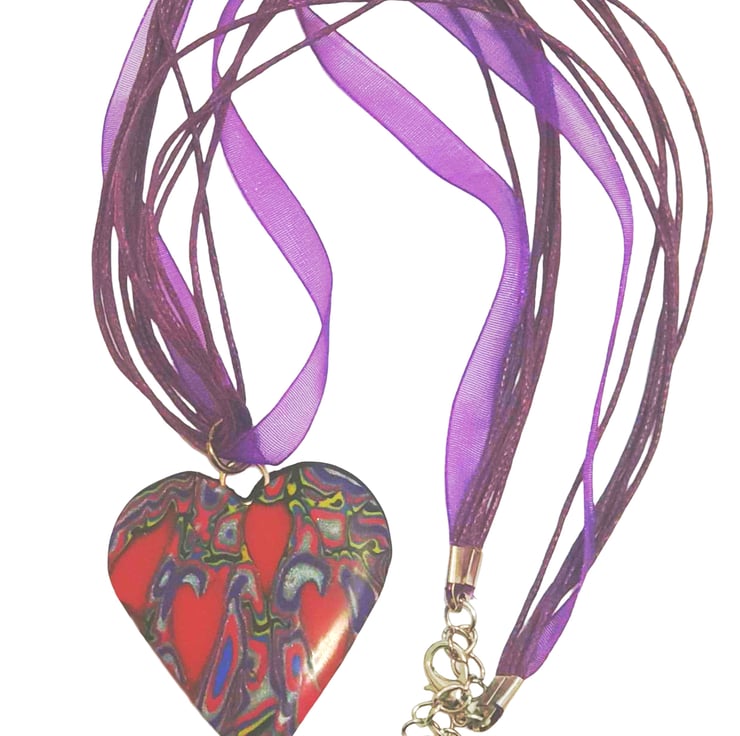 This is a beautiful large multi coloured heart pendant hung on pretty purple cotton cord and ribbon necklace.