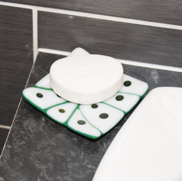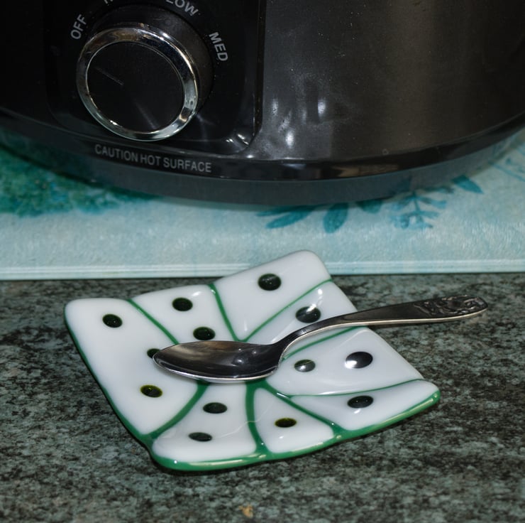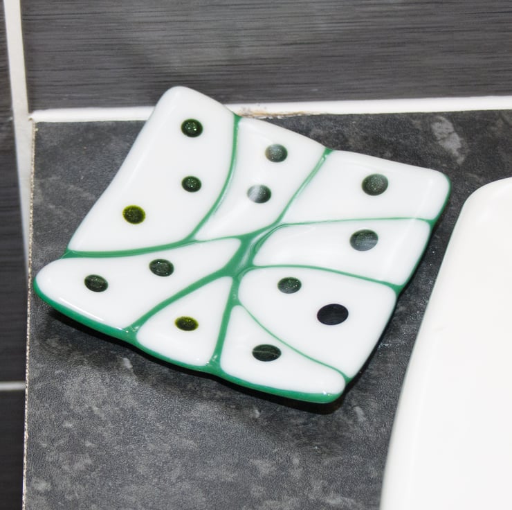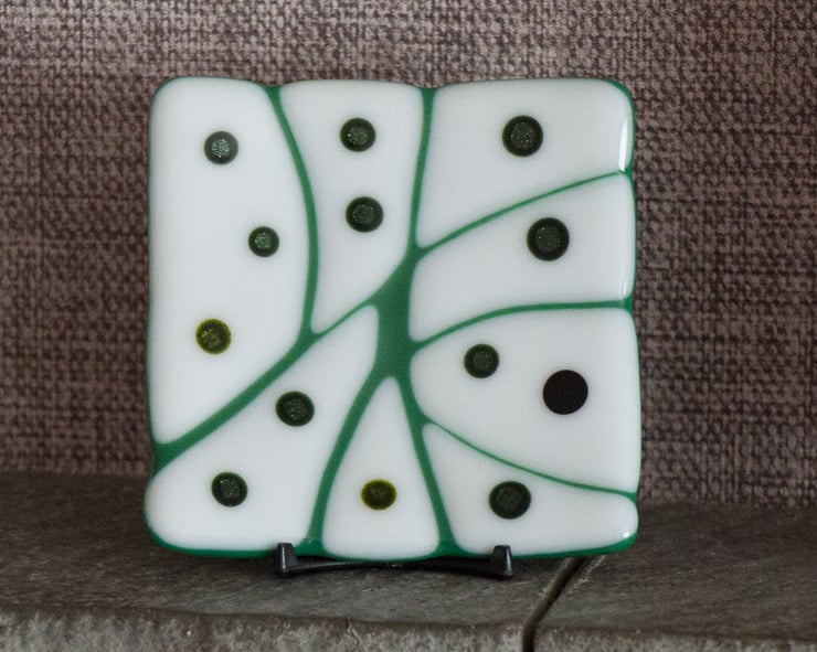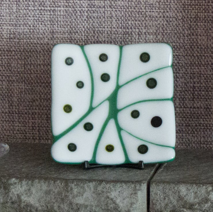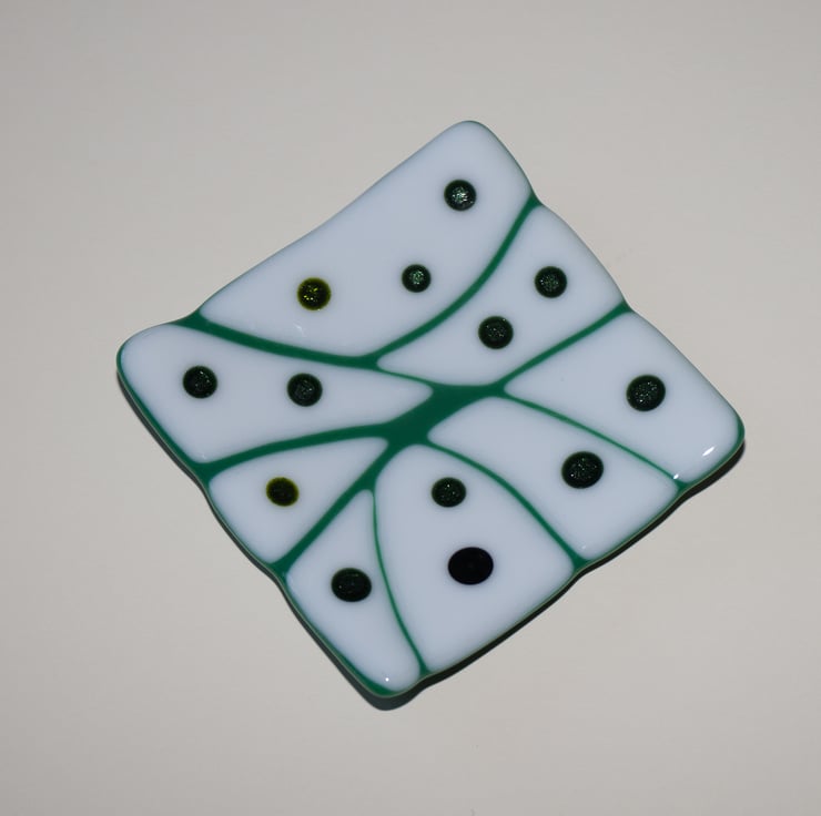 We make this design using a sheet of green glass, hand-cut to the required size for the base. We then cut a second sheet slightly smaller, this one in white, and cut it into shape to look like it's been shattered. These are arranged on the base sheet. The first visit to the kiln fuses all the glass into a single sheet, but unlike some of our other pieces, this piece has a smoother texture. A second visit to the kiln is required to create the dish shape.