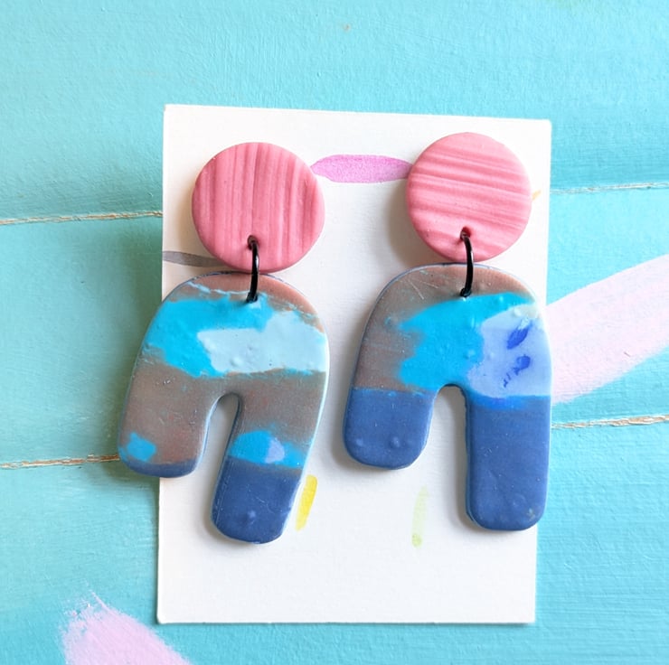 Make a bold statement with these unique, lightweight handmade dangly earrings in blue and pink.