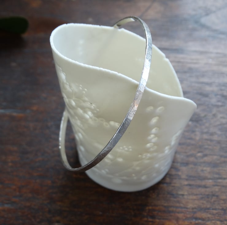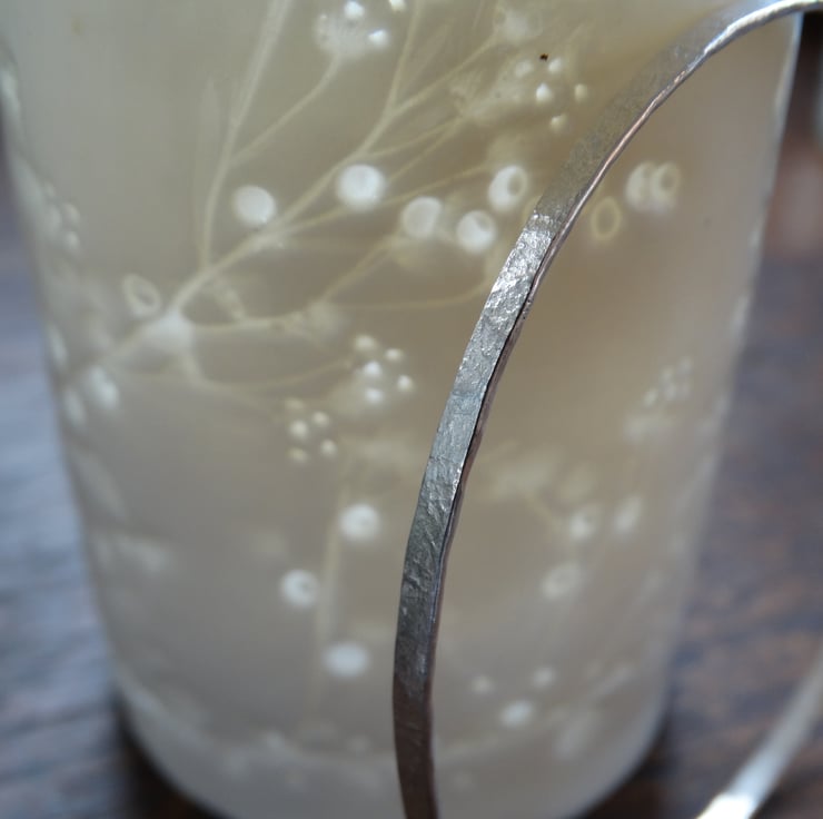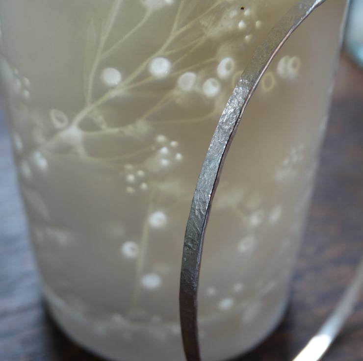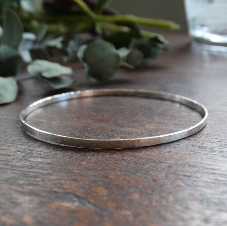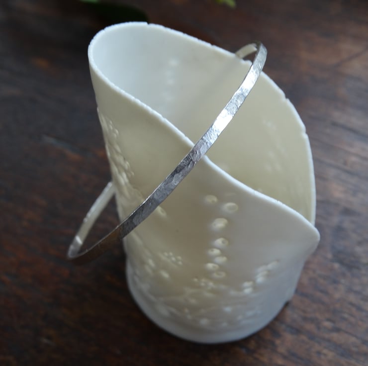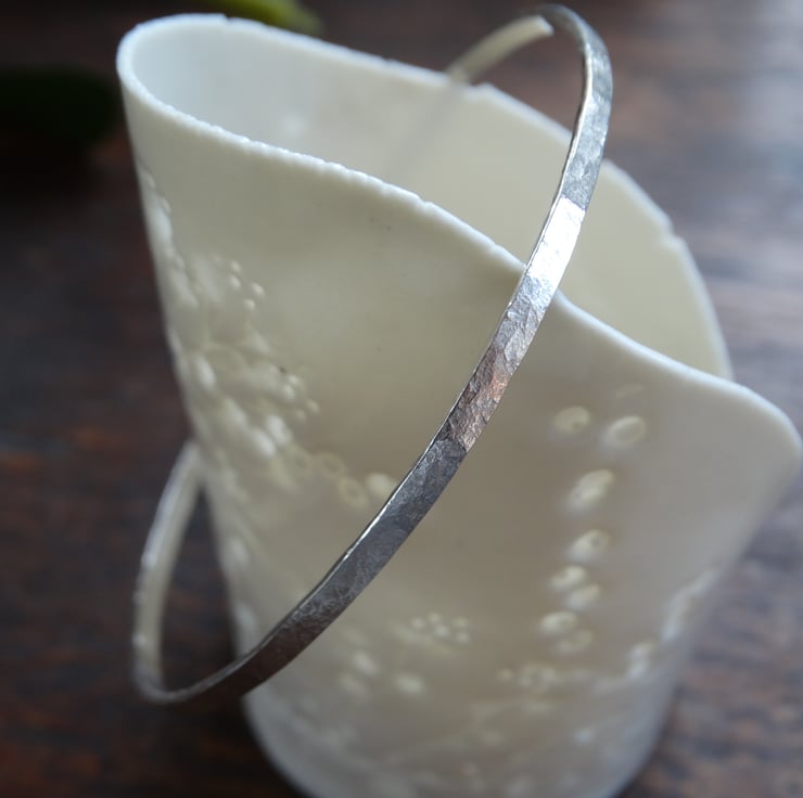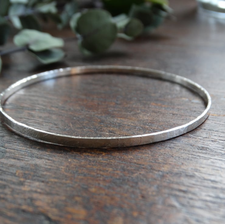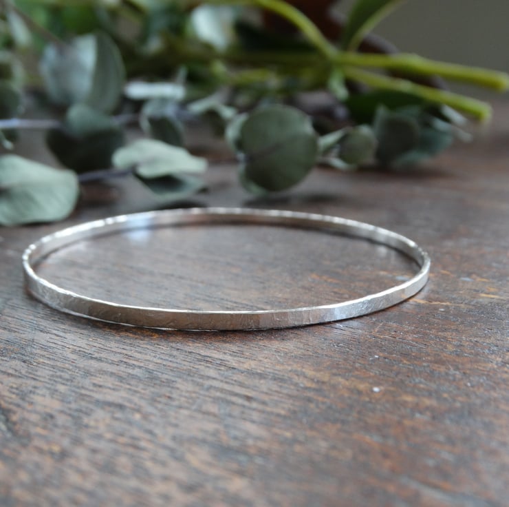 A beautifully simple bangle made entirely by hand from recycled sterling silver. It has been hand-beaten to texture the silver and then polished by hand to give a soft, matt finish rather than a highly polished shine. It looks elegant worn alone, or can be stacked with others.