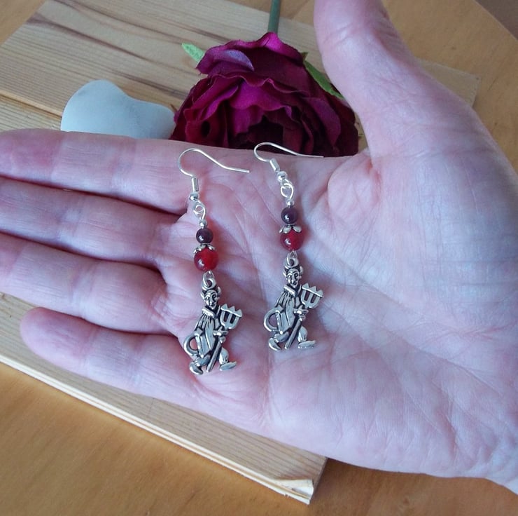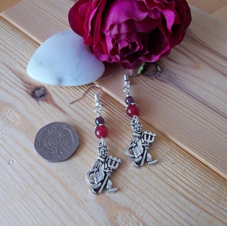Garnet & Red Agate gemstone beaded devil earrings. These cute little devil charm drops would make a lovely 'I love you gift' for Valentines day, birthday, anniversary or just because!