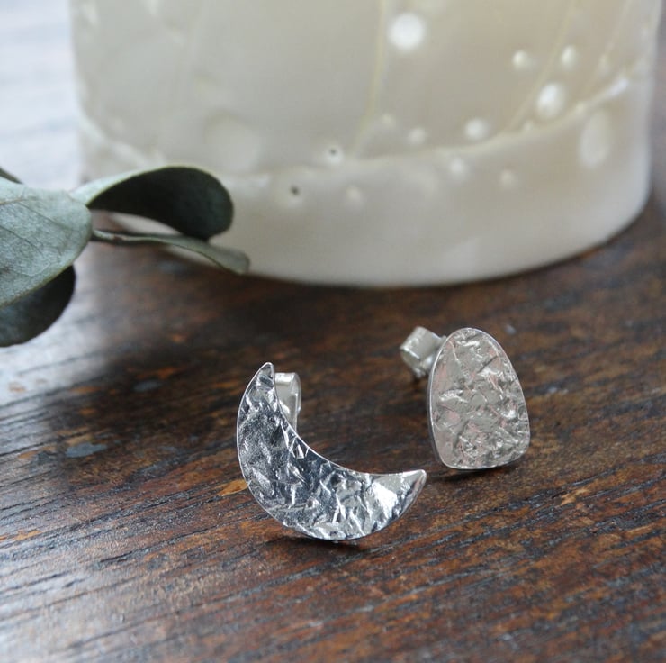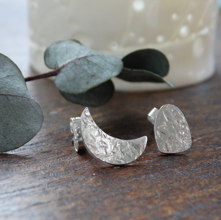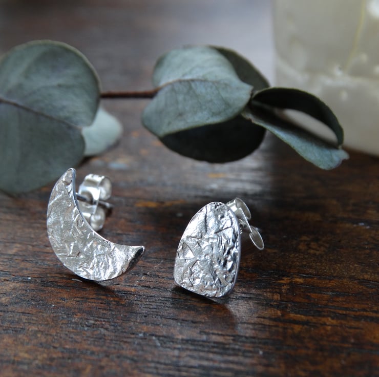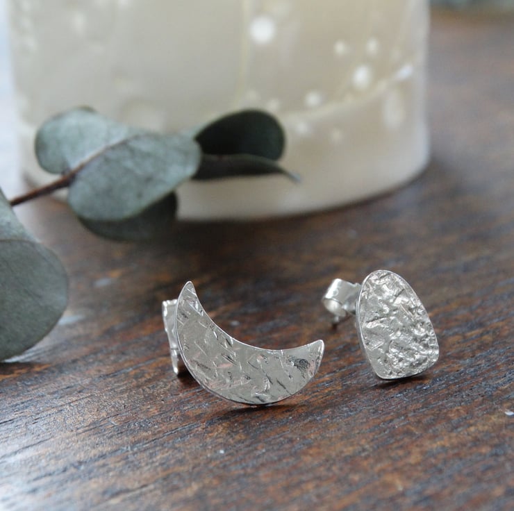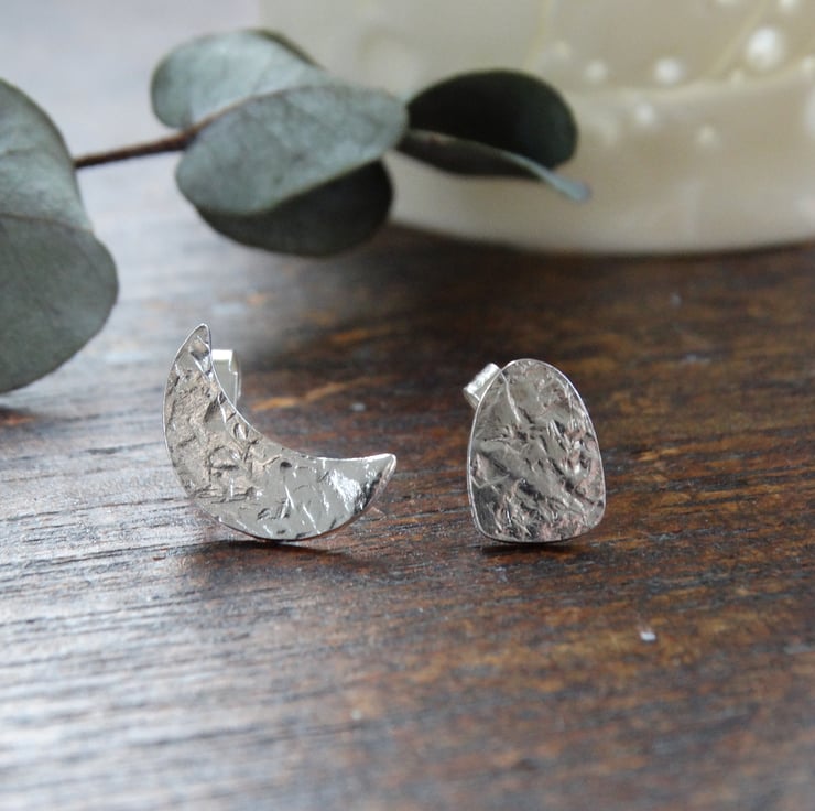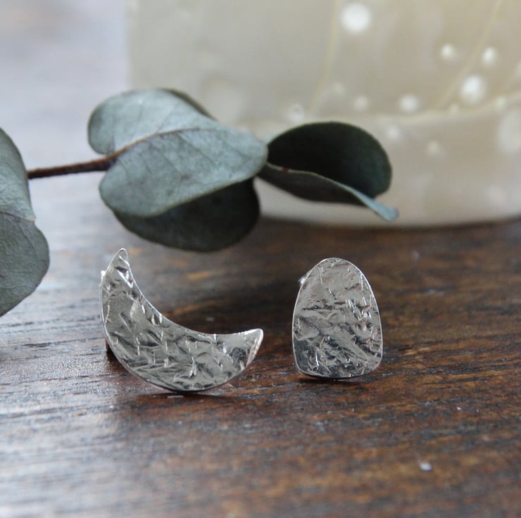 This pair of mismatched studs - one crescent moon and one megalith shape - has been made entirely by hand using traditional silversmithing techniques. The shapes are drawn on to recycled sterling silver sheet and then cut out by hand using my jeweller's saw. The silver is hand beaten to give it my signature frost inspired textured, and the earrings are polished by hand to give the silver a lovely glow rather than a high shine finish.