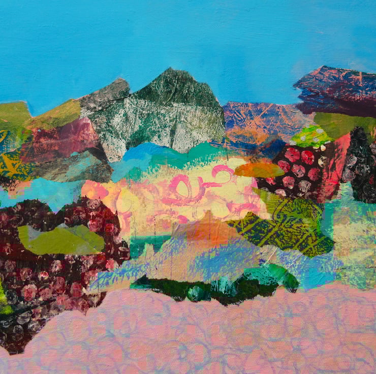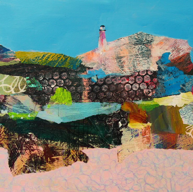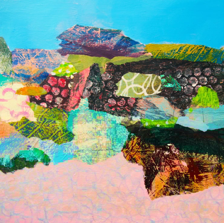 Large abstract seascape / landscape painting in acrylic, collage and oil pastel on 36 x 12 inch stretched vinyl. The 1.15 inch edges are painted so no framing is necessarily required. This is an unusual and interesting hand painted and collaged original with a lot of impact, which would make a gorgeous focal point in any interior. It is signed on the front by Bea and comes with certificate of authenticity.