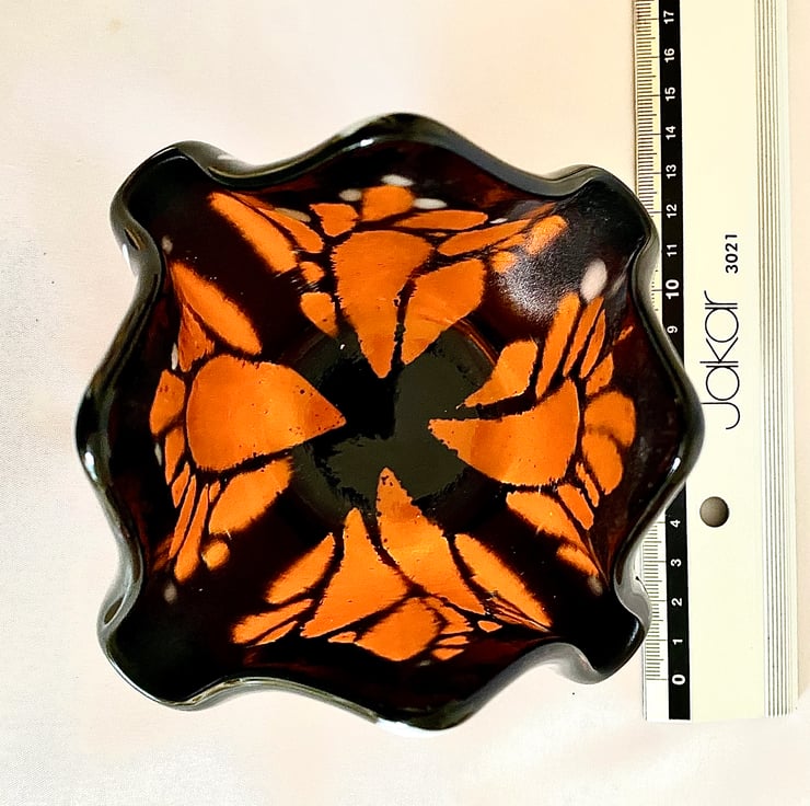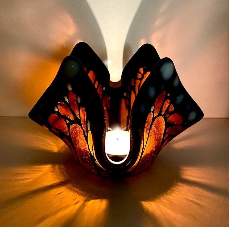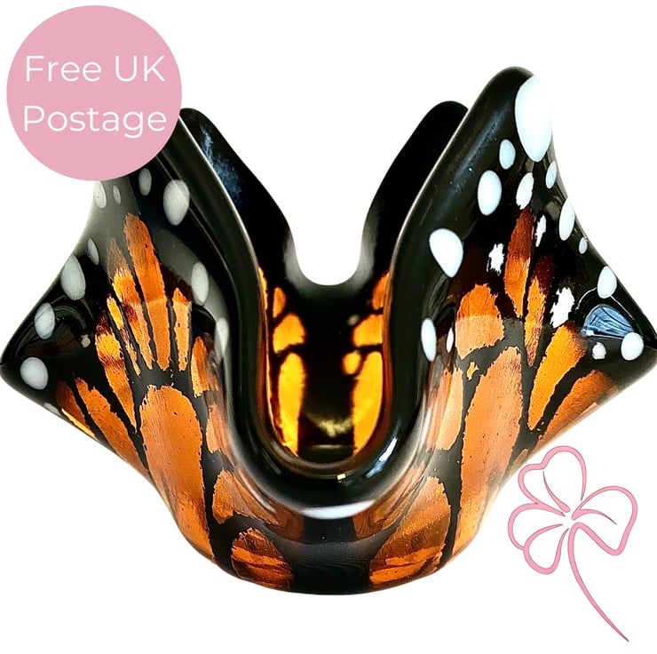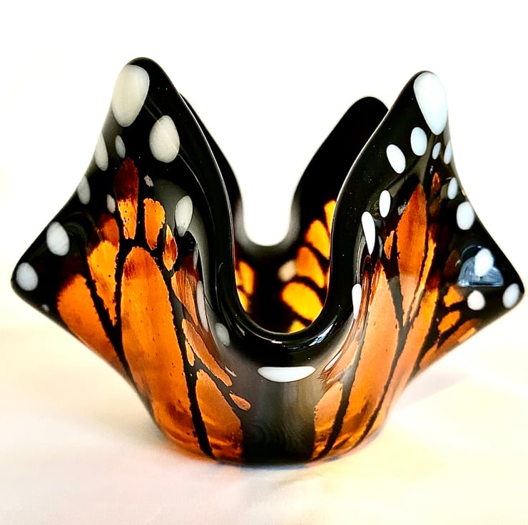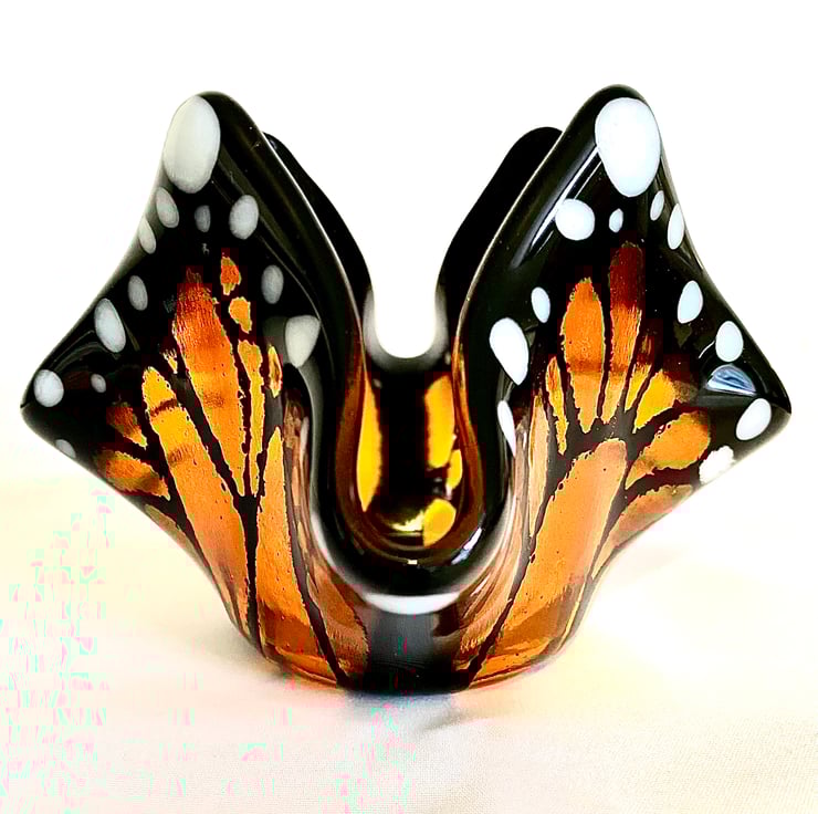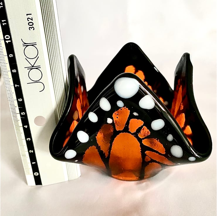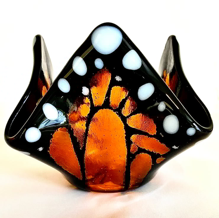 This Butterfly styled vase was first fused as a flat piece to create the pattern. Hand cut orange art glass, black opal strips and white dots were arranged on a clear 15cm square base. It was fired to 730 degrees Celsius in its first overnight firing. A second overnight firing took place at 790 degrees Celsius to add in the black outlines of the wings to complete the pattern. A third overnight firing at 670 degrees Celsius then took place, draping the flat sheet over a vase mould to allow it to naturally slump over into this handkerchief folded shape.
