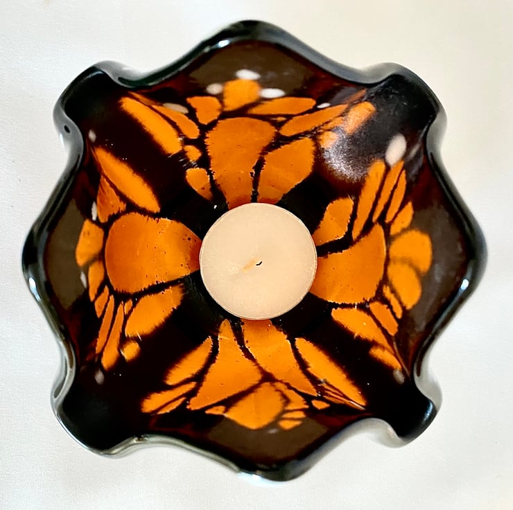 The end result is beautiful as a candle holder, fitting both small and larger tea lights. It’s also perfect as a decorative dish, ideally suited with a window behind to show off the beautiful blue glass.