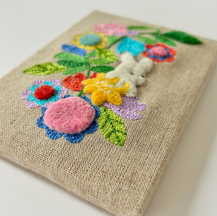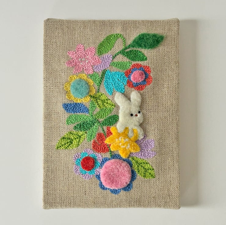 This is an original piece of Punch Needle art, featuring a little fluffy bunny (called Floofle) amongst some flowers. Hand embroidered by me onto linen.
