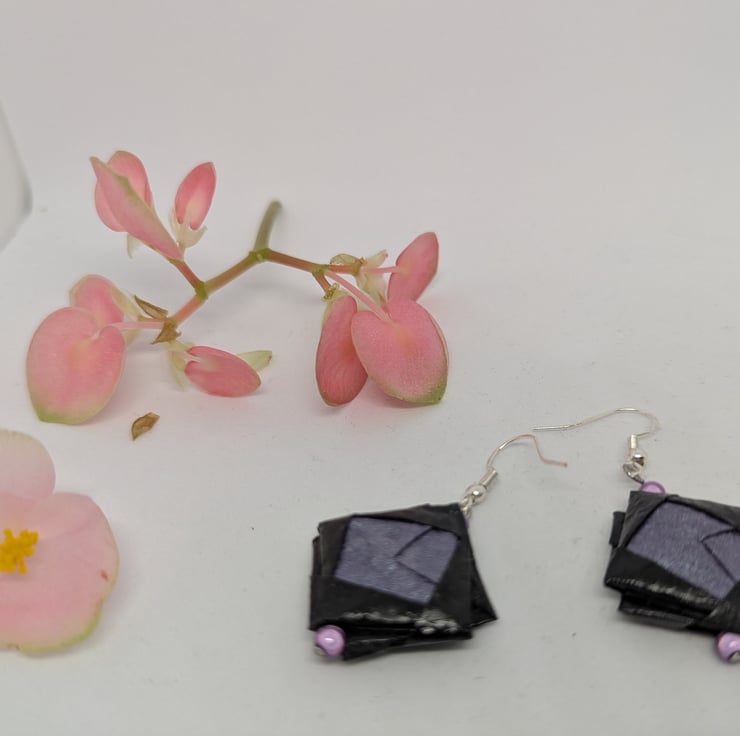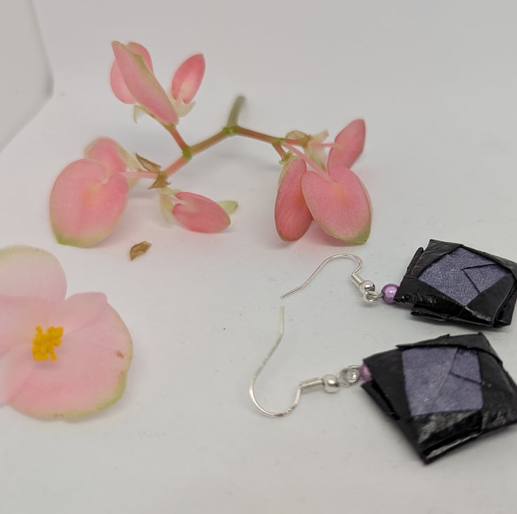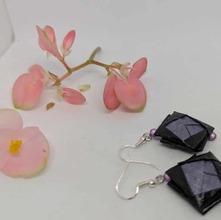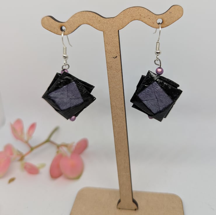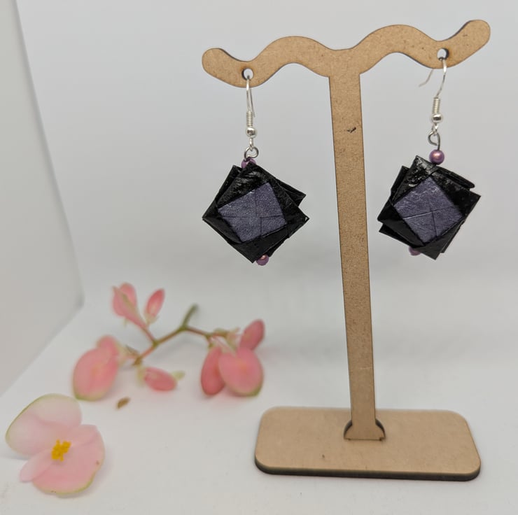 These uniquely designed earrings have been created using 2 types of Japanese Shoyu paper which is folded using origami techniques. The design is completed with the addition of lilac miracle beads and sterling silver ear hooks, to produce earrings which measure 3 cm in length.
