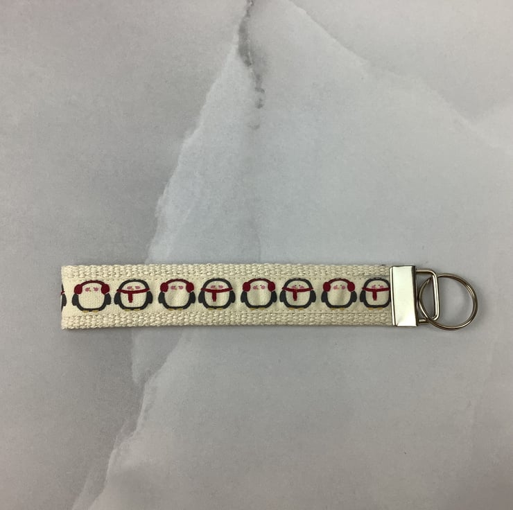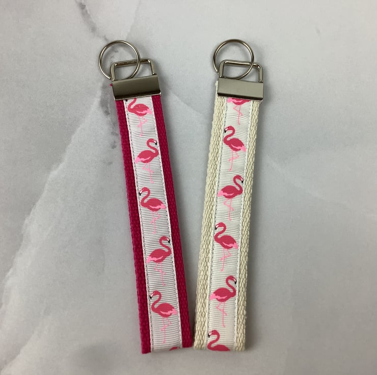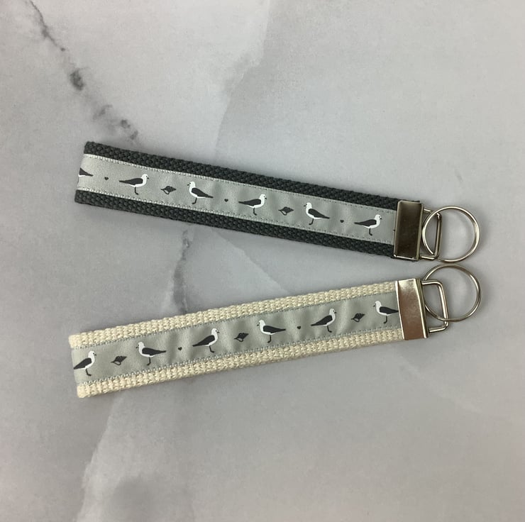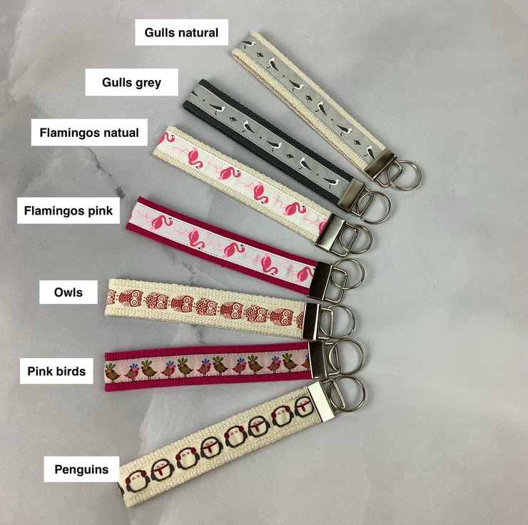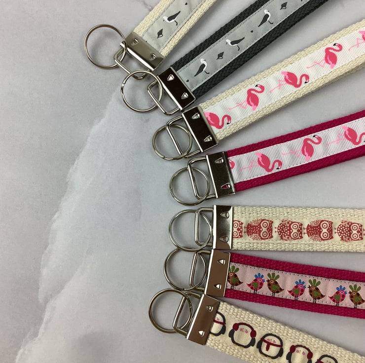 Handmade fabric key fob with a fun choice of bird themed ribbons backed by a cotton webbing.