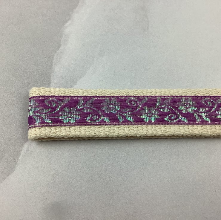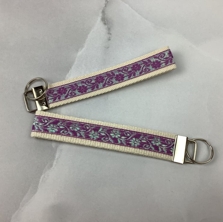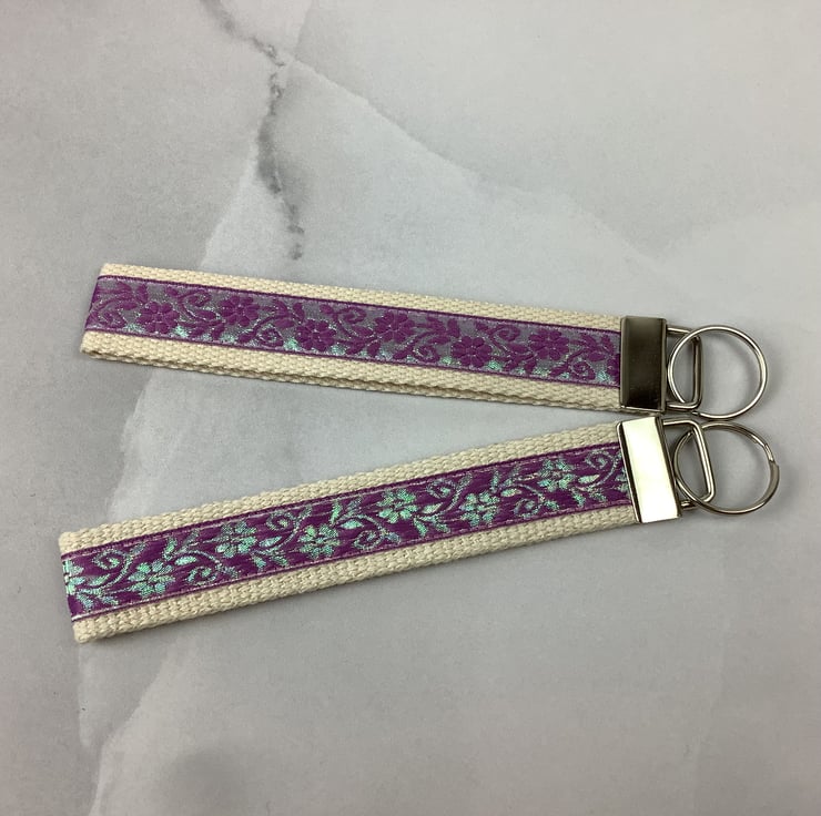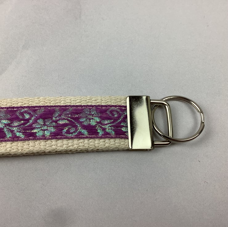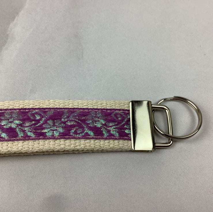 Handmade fabric key fob with a pretty iridescent mauve ribbon backed by a natural coloured cotton webbing.