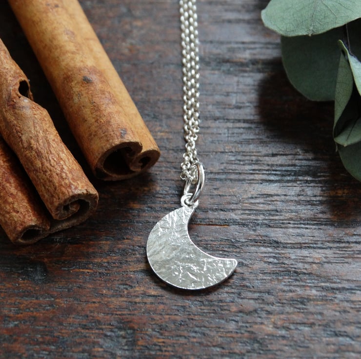 These sweet little crescent moon pendants are made entirely by hand. I start by drawing each one onto recycled sterling silver sheet, and then cutting them out by hand from using a jeweller's saw. They are filed and sanded by hand, and textured all over to give them my signature frost inspired finish. These pieces are all hand-polished to give the silver a lovely glow rather than a super shiny finish.