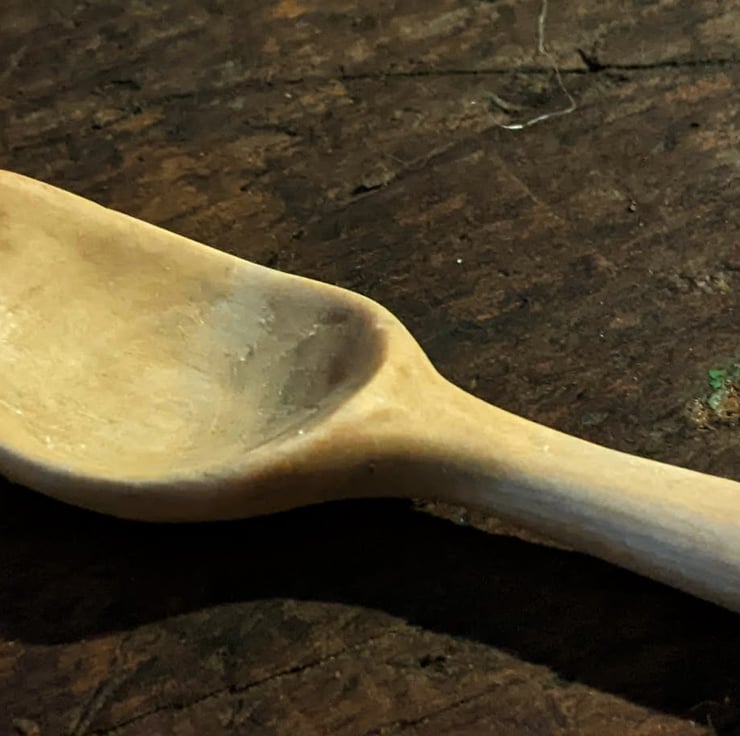A unique and individual Birch hand carved spoon. This beautiful spoon was carved whilst sat around a fire in a wonderful woodland. Thus bringing an essence of the outside to enhance any meal time, or kitchen environment.