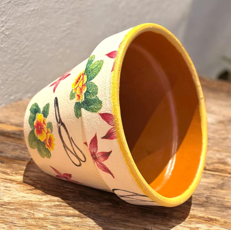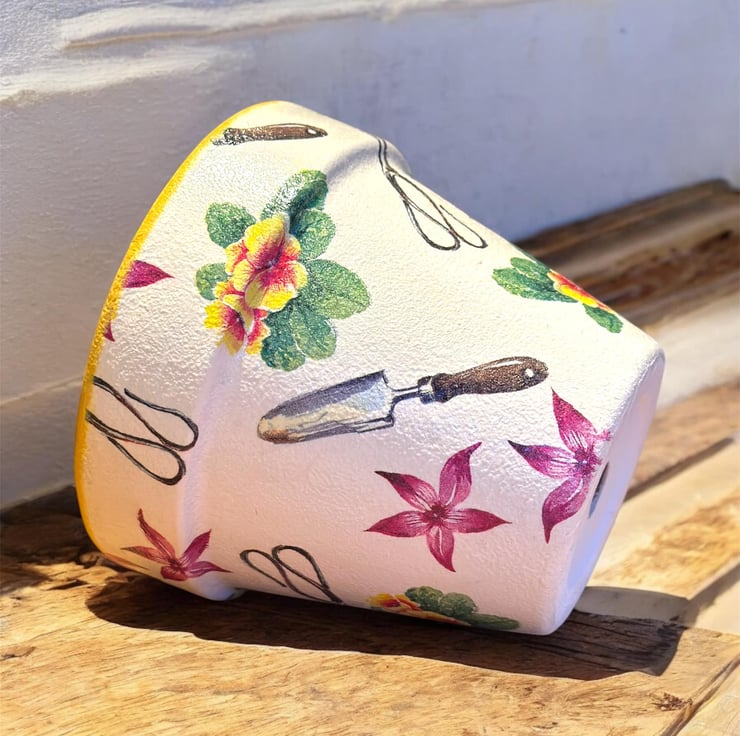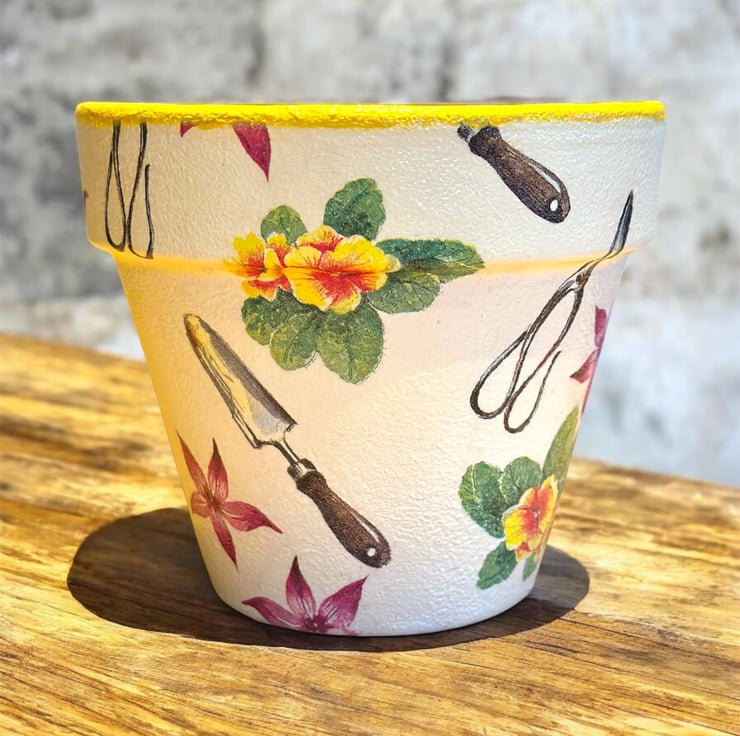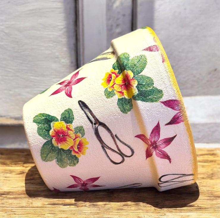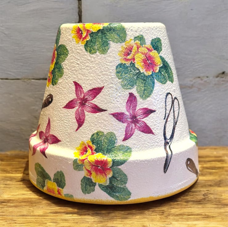 The image has been applied to a terracotta pot after being painted with Annie Sloan chalk paint using the art of Decoupage and finished a water resistant varnish.