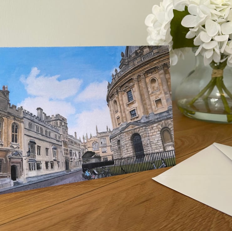 A high-quality greetings card of my 'Brasenose College and The Radcliffe Camera' oil painting, measuring 17.7 cm x 12.6 cm (7" x 5"), with white envelope.