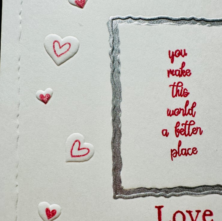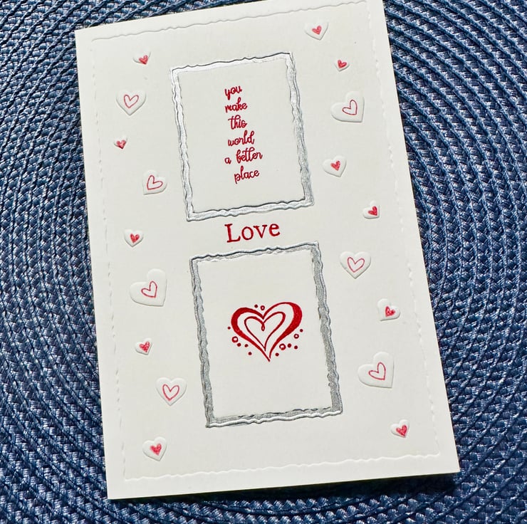 With the text “you make the world a better place” and “love” in red and embellished in hand painted silver embossed frames surrounded by embossed love hearts. This card could be for valentines, an engagement or anniversary or just to say I love you.