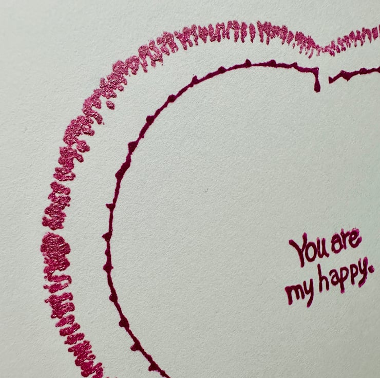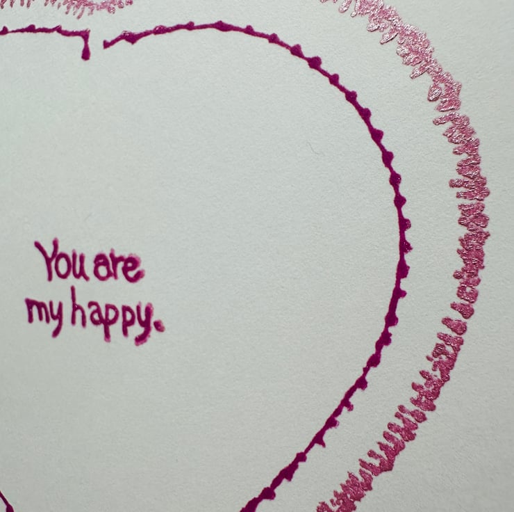 A minimalist yet loving valentine card with the message “You are my happy” inside a large heart printed with a shimmering rose pink ink outer heart with an inner dark pink heart on a quality, heavy, acid free white card.