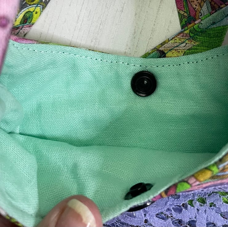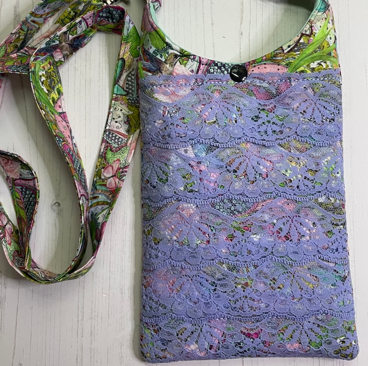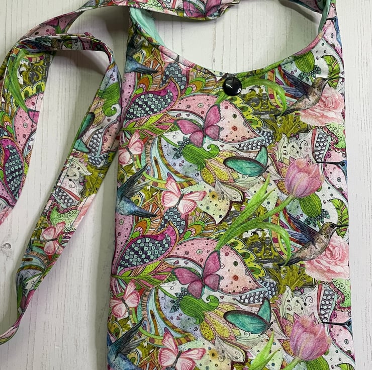 Layered cross body shoulder bag. In a beautiful cotton print of florals, hummingbirds and butterflies. Shades of green, blue, purple and pink. Layered blue lace across the front.