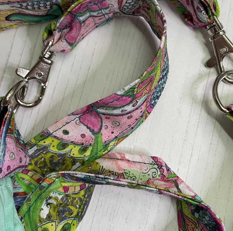 A perfect size for a day out will easily hold a phone and wallet. Lined with mint green cotton. Black Kam snap to secure the top. Side loops have silver D rings to secure the strap on lobster clasps.