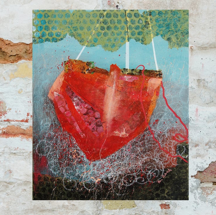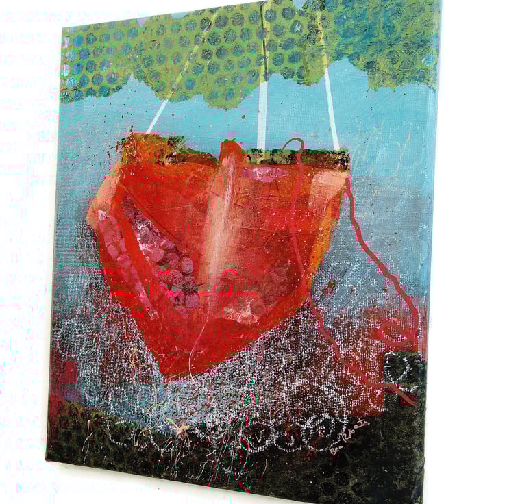 Original abstract, mixed media painting in acrylic, collage, drawing pens and oil pastel on 10 x 12 inch stretched canvas. The 0.75 inch edges of the canvas are painted so no framing is necessarily needed - just unpack and hang. Alternatively, frame for further impact. This abstract, mixed media boat / harbour painting has attractive bold shape, interesting marks and paint splashes. It is hand signed on the front. All my paintings come with a certificate of authenticity.
