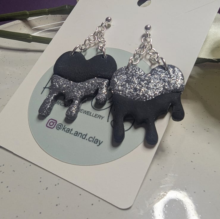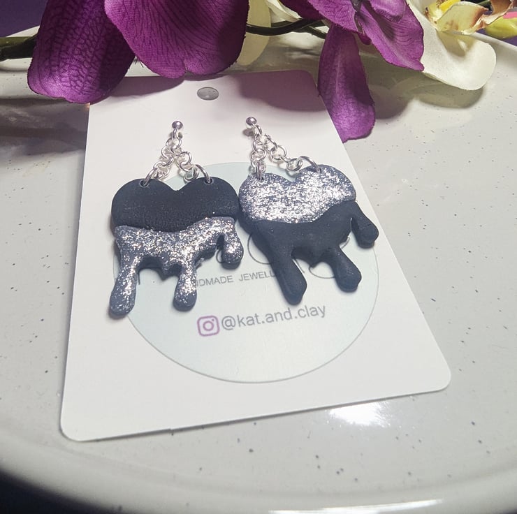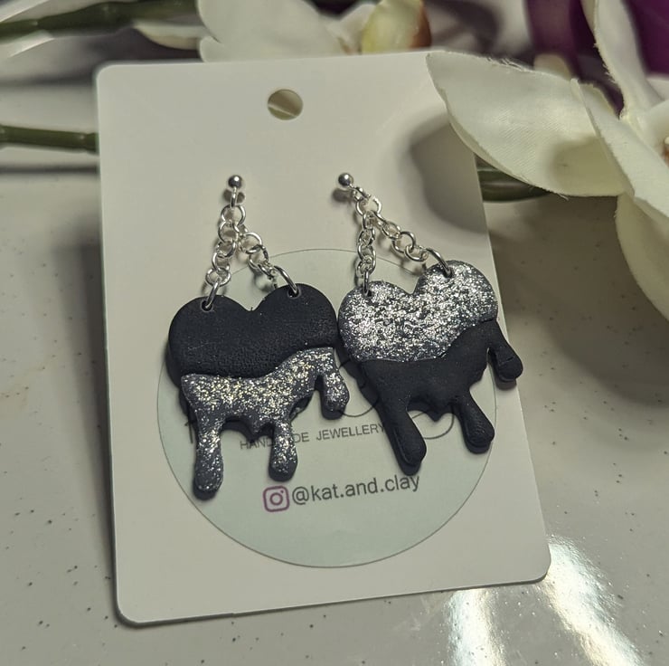 Black and silver dripping earrings with a chain detailand steel earring post. Made from FIMO polymer clay and silver coloured steel studs and fixings.