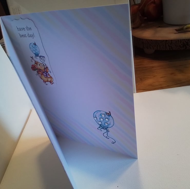 Inside the card, another mouse friend holds a sign saying 'have the best day' and there is also a picture of a balloon inside.