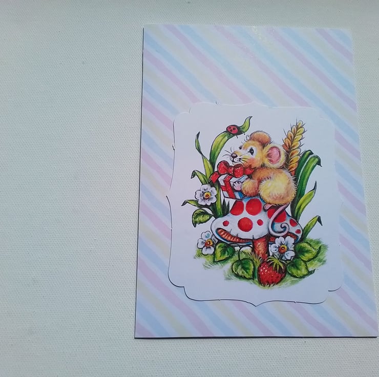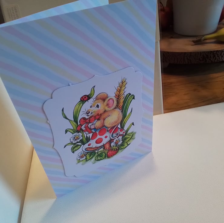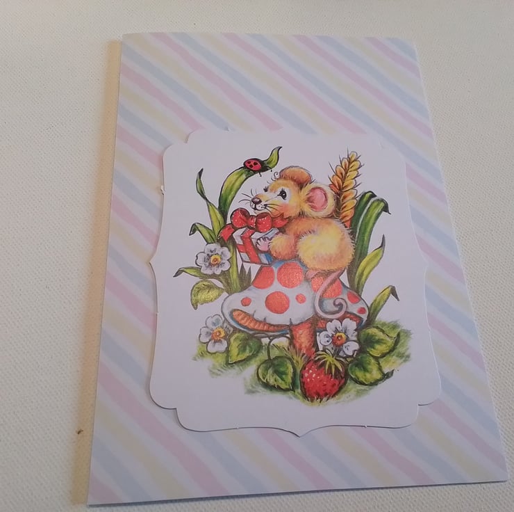 This any occasion card features a cute mouse sitting on a toadstool holding a gift for someone special.