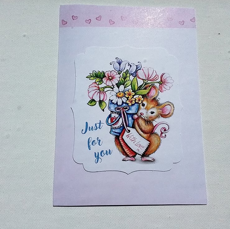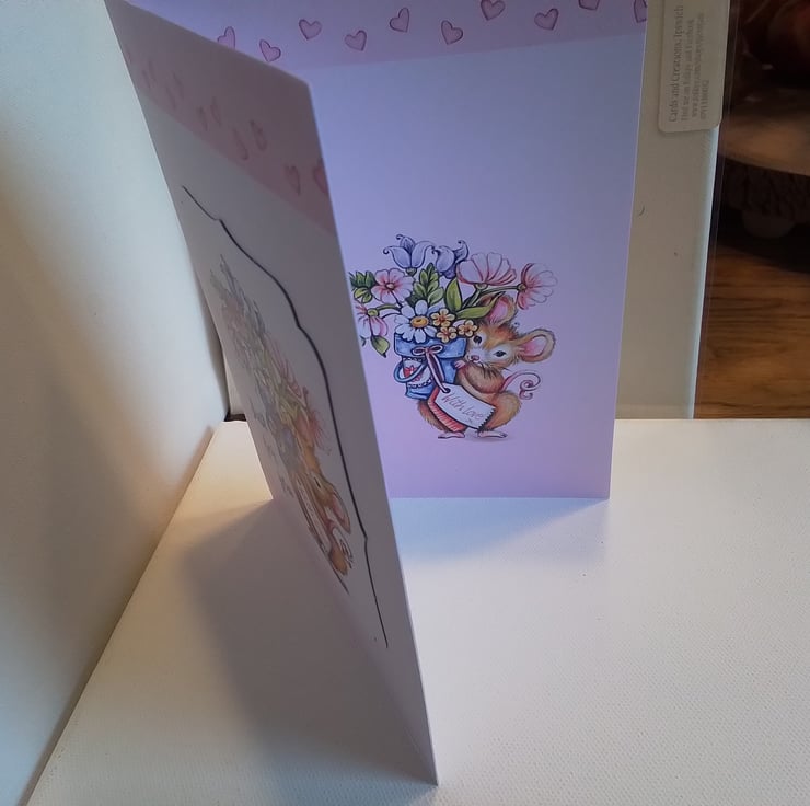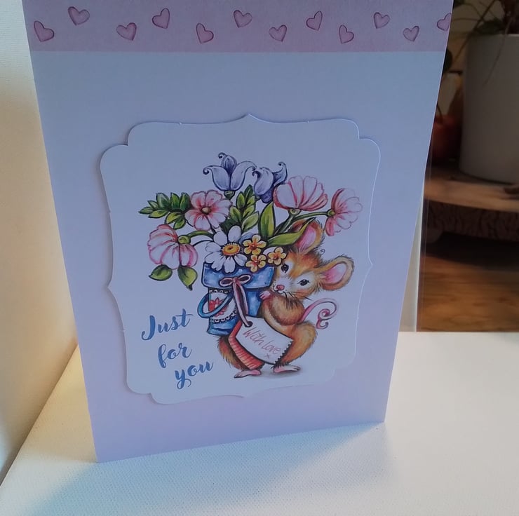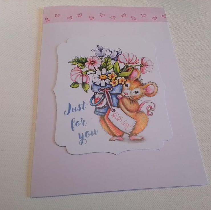 A lovely card featuring a mouse holding a massive bucket of flowers.