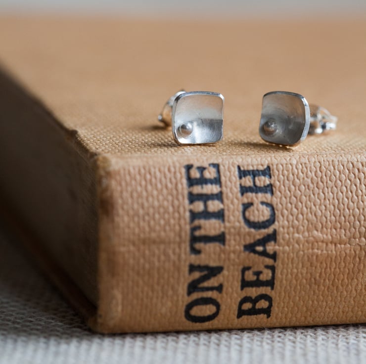 Each square shaped earring is hand cut from recycled sterling silver, gently curved and a tiny silver pearl offset in one corner. The brushed silver finish breathes the ocean life into them.