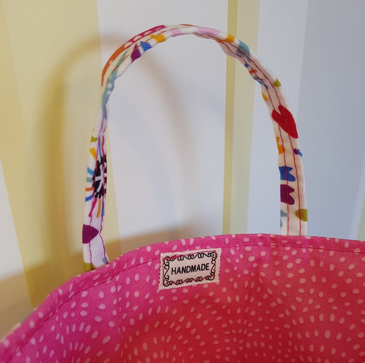 Handsewn by me with cotton fabric it is lined and interlined so will keep its shape. And it can be used to keep something in so has a future use too.