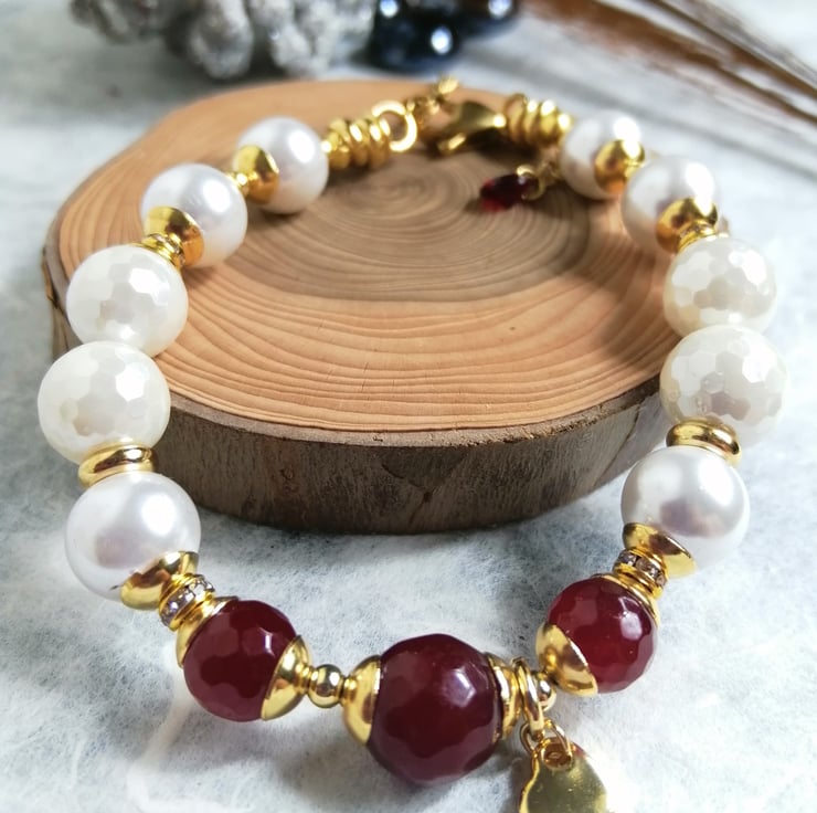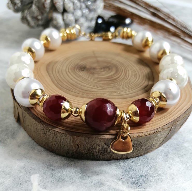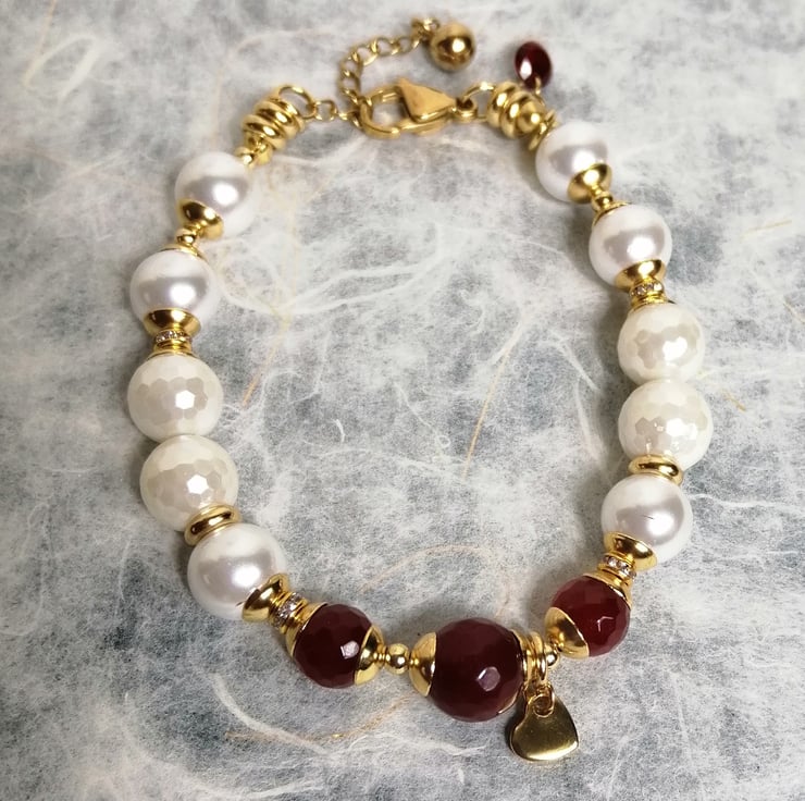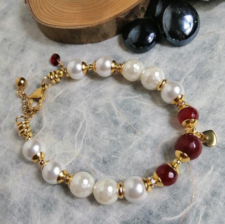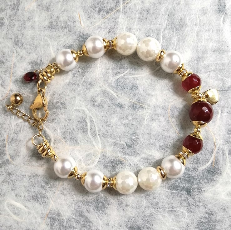 Red white & gold beaded valentine bracelet, quartz jade and pearl