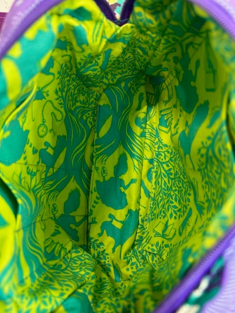 The external fabric features the "Cheshire Cat" looming in the night sky watching over Wonderland. The lining fabric depicts Alice falling down the rabbit hole surrounded by curious objects.