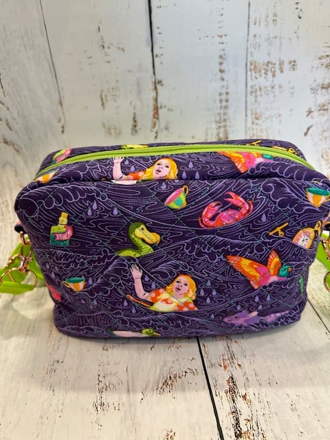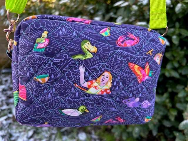 A lovely, softly quilted camera style cross body bag, created using 100% cotton from the Curiouser and Curiouser range by fabric designer Tula Pink. The Curiouser and Curiouser designs are based on the wonderful Alice in Wonderland book by Lewis Carroll.