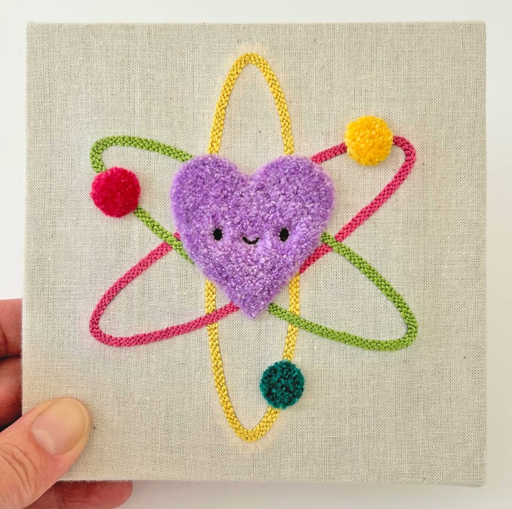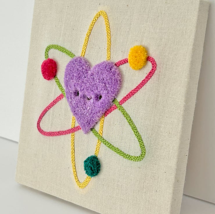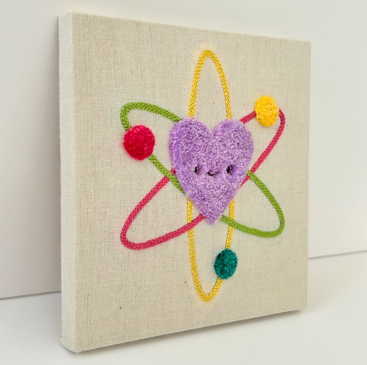 This is an original piece of Punch Needle art, featuring a happy heart shaped atom. Hand embroidered by me onto cotton cloth.