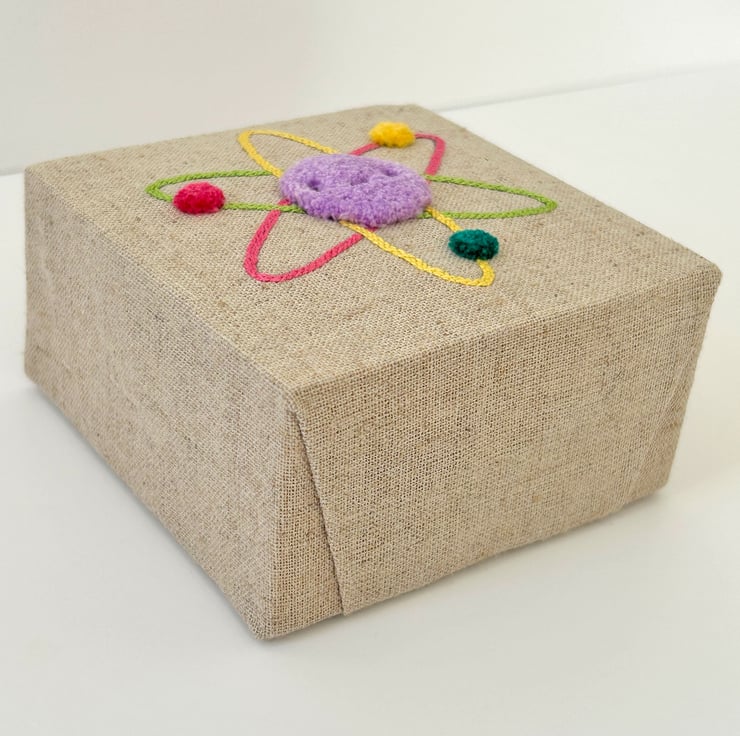 This is an original piece of Punch Needle art, featuring a happy atom. Hand embroidered by me onto Linen.