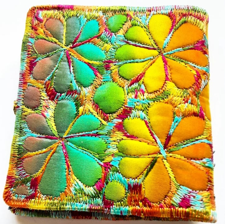 Made from layers of fabric including hand dyed Egyptian cotton and silk fabrics using the free machine embroidery style of sewing