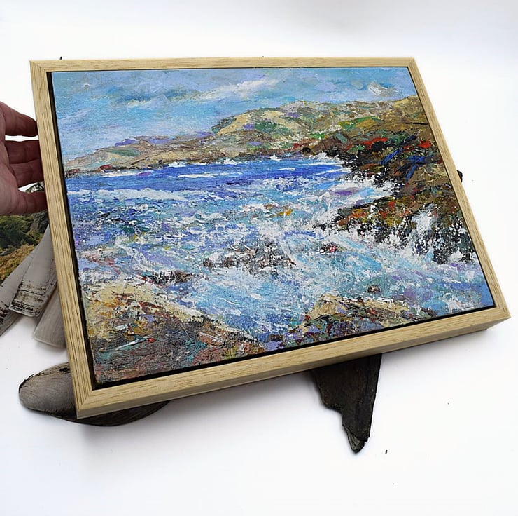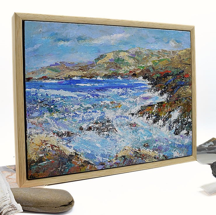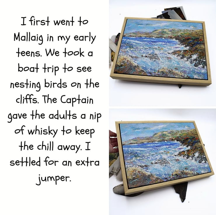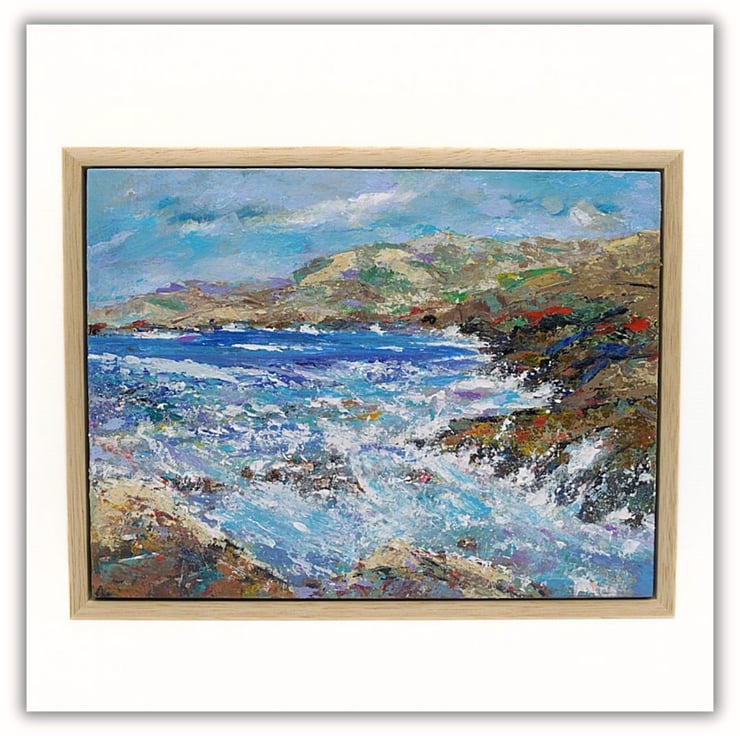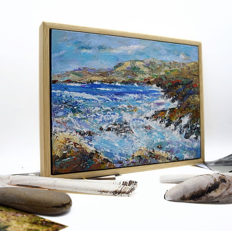 This is an original coastal landscape of Mallaig in Scotland. Layers of pastel blues depict a calm sky that contrasts with the choppy, wild waters around the coast. I have used sweeping brushstrokes to paint the sky and the sea in the middle ground. The sea in the foreground has been painted with a palette knife and various sponges to create texture and movement. I've applied layers of earth tones for the cliffs with hints of reds, blues, purples and ochres peeping through to indicate the ruggedness of the land holding firm.
