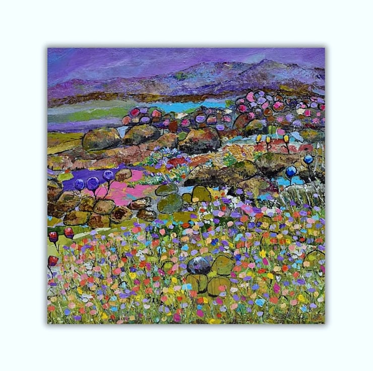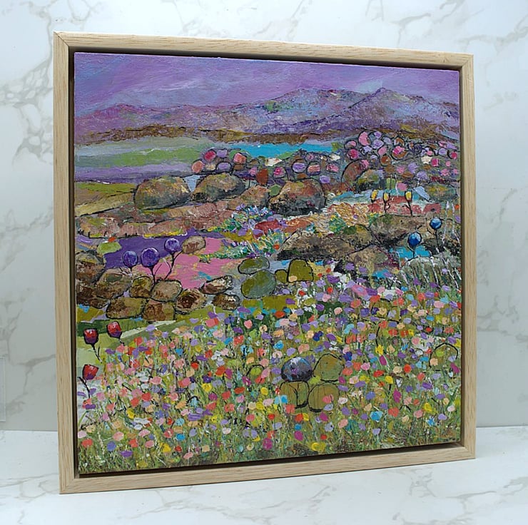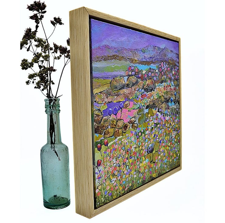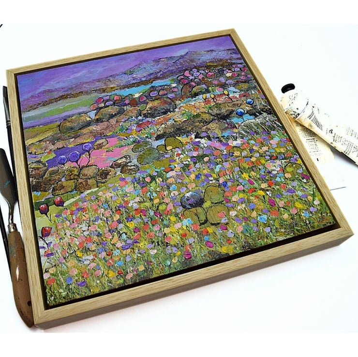 This is an original framed Scottish landscape painting. It features the wildflowers of The Machair which hug the coastline of South Uist. The machair is always a colourful wonder to behold. I have used sweeping brushstrokes, sponges and knives to apply think layers of paint to evoke both the wildness of the area but also the fragility of the landscape. Some key features of this original work include: